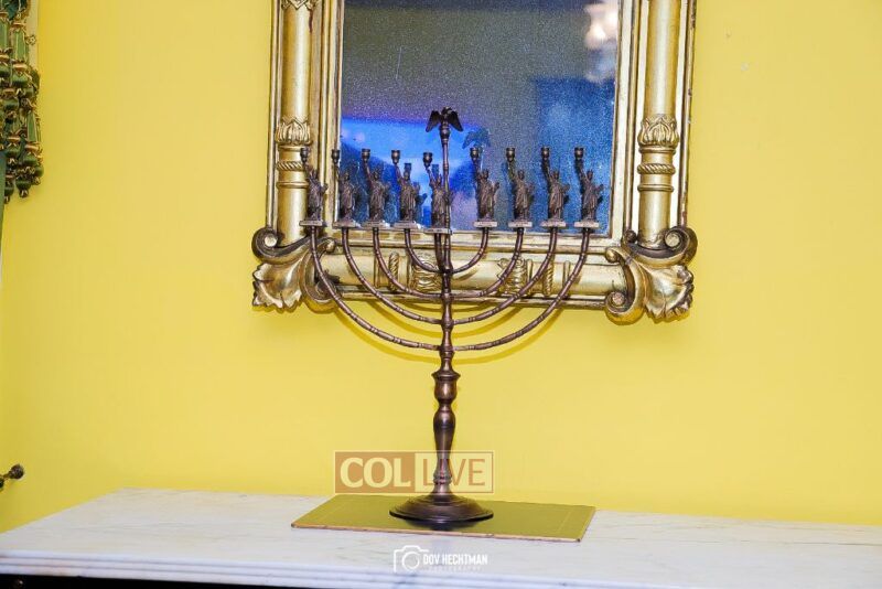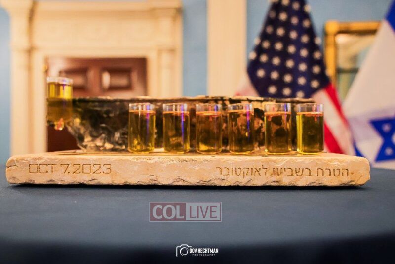 The menorah, designed by Eliyahu Skaist, is engraved with the words in Michah (7:8): “Do not rejoice over me, my enemy! Though I have fallen, I will rise (again); though I sit in darkness, Hashem is my light.”