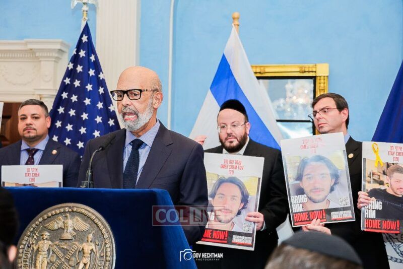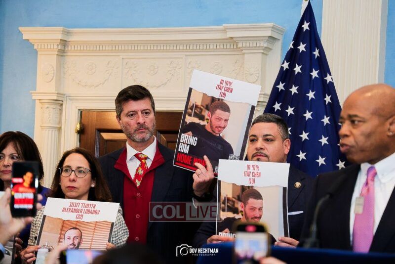 Posters of the hostages who are still held by the Hamas terrorist group were held up as Mayor Adams demanded their release.