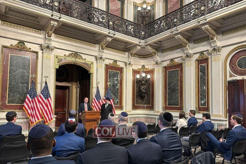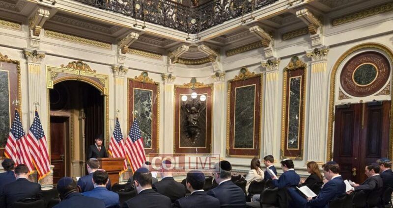 Jewish staffers gathered in the Indian Treaty Room at the White House in Washington, DC for a Megillah reading on Purim Day at an event hosted by American Friends of Lubavitch (Chabad) led by Rabbi Levi Shemtov.