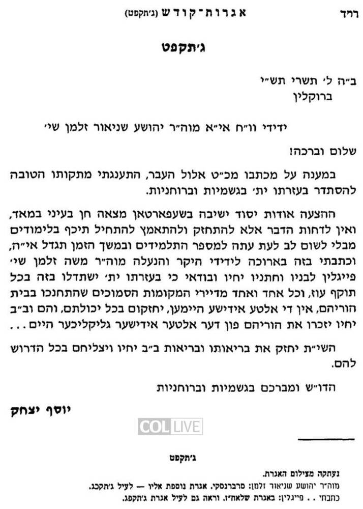Rosh Chodesh Cheshvan 5780 marks 70 years to the day from when the Frierdiker Rebbe wrote to Reb Zalman Serebryanksi, accepting his proposal to establish a Yeshivah in Australia (originally located in Shepparton), and in fact, urging him to do so without delay.