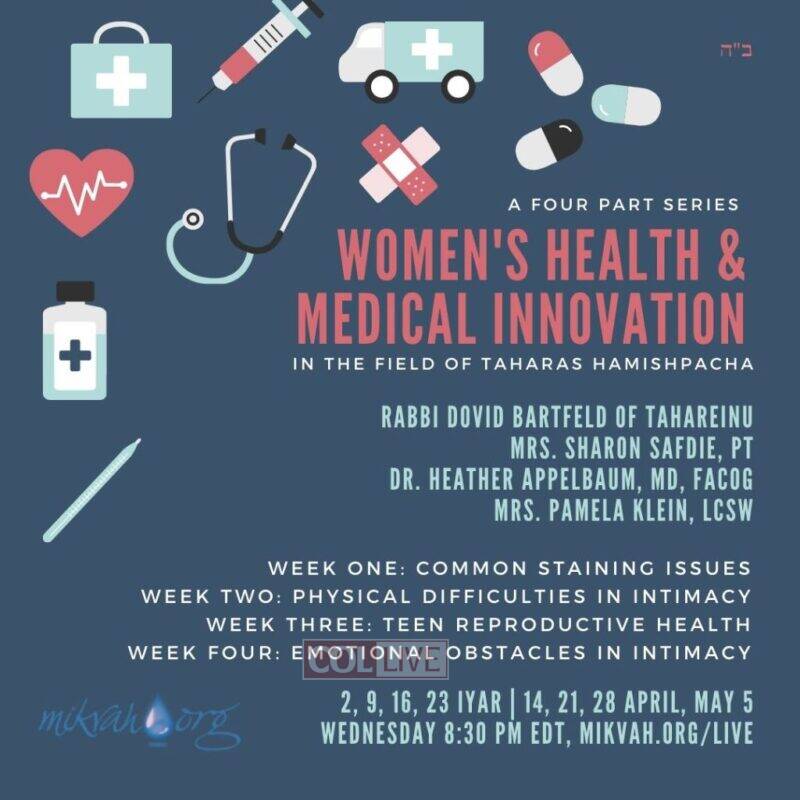 Mikvah.org is offering an amazing series on medical innovation and women’s health as relevant to the field of Taharas Hamishpacha each week on Wednesday, 8:30 PM EDT at mikvah.org/live