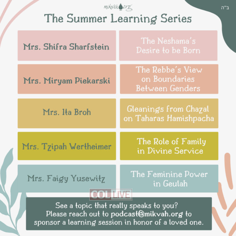 Starting at the end of June, we will be hosting a Summer Learning Series on a live zoom and/or on the mikvah.org podcast.