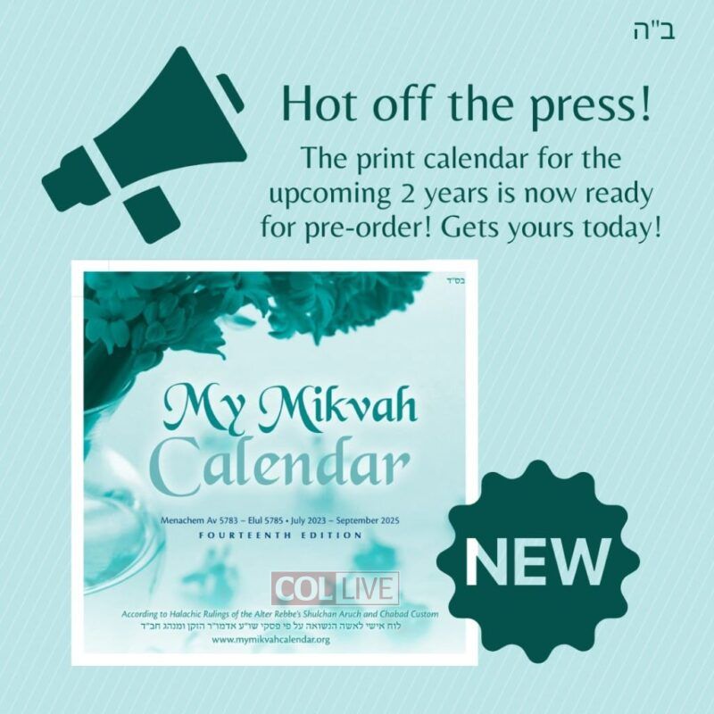 Important: The new Mikvah Calendar – beginning in Av, 5783 – is available for purchase.