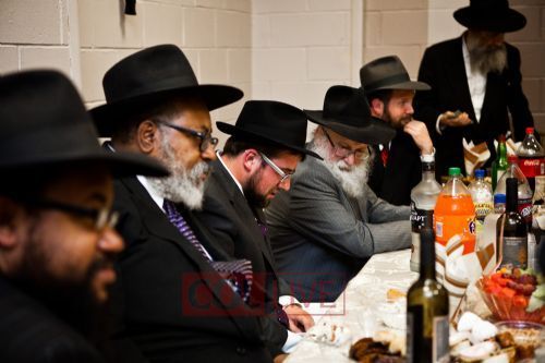 With musical accompaniment, the hall broke out in joyful dancing and then regrouped for a full zal farbrengen until the morning.