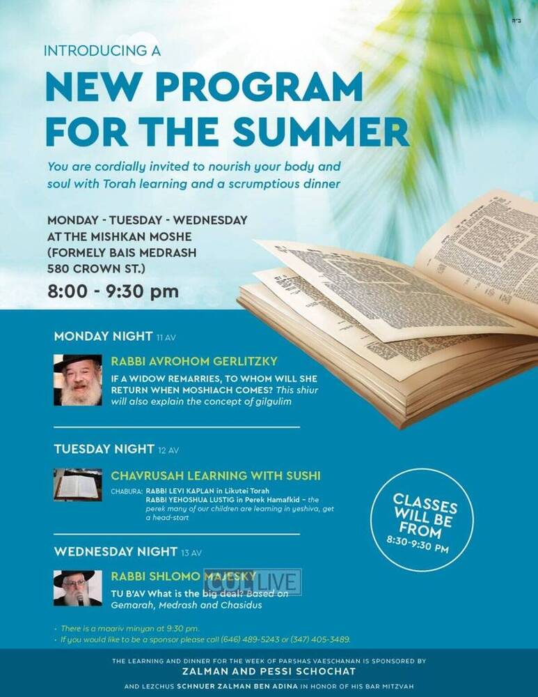 The program, which will continue throughout the summer, takes place on Monday, Tuesday and Wednesday evenings at the New Beis Medrash, 580 Crown Street, 8:00 – 9:30 pm.