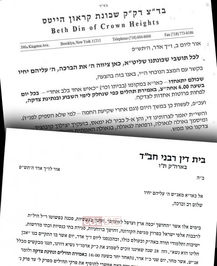 The Crown Heights Beis Din called for residents of Crown Heights to join in prayer from their homes at 4 pm EST daily, and recite the Tehillim as divided by day and give Tzedakah.