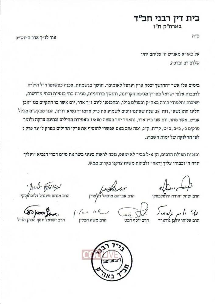 According to the בית דין רבני חב״ד letter, Israelis will gather at 4pm Israel time