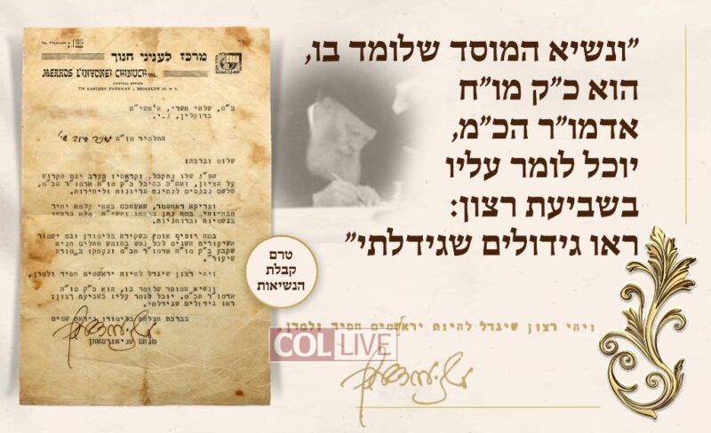 Also featured is a letter by the Rebbe written during the year of mourning for the passing of the Rebbe the Rayatz, before he accepted the Nessi’ut! The letter is written on the official stationery of the Merkos L’Inyonei Chinuch. The wording of the Igeret Kodesh clearly shows the Rebbe’s reluctance to accept the burden of the Nessi’ut and his adherence to his belief that all matters derive directly from the power of the Rebbe the Rayatz. Among others, the Rebbe writes: “הפ”נ שלו נתקבל, וקראתיו בערב יום הקדוש על הציון, ואח”כ בהיכל כ”ק מו”ח אדמו”ר הכ”מ, שלשם נכנסים לנתינת פדיונות ויחידות… וצדיקא דאתפטר, דאשתכח בהאי עלמא יתיר מבחיוהי, בטח נתן ברכתו והשי”ת ימלא ברכתו בגשמיות וברוחניות”.