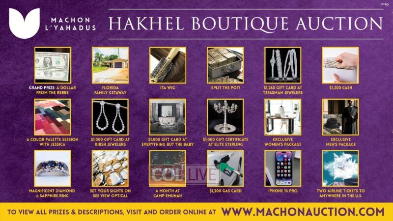 Machon L’Yahadus’s Boutique Auction offers the special Grand Prize of a dollar from the Rebbe, as well as 17 other sensational prizes including an Ita Wig, a Kosher Florida Getaway, Cash, gift certificates to Tzfasmans, Elite Sterling, Kirsh Jewelry, Everything But the Baby, Seeview Optical, split the pot, and more! A $30 entry tickets includes a $25 raffle ticket.