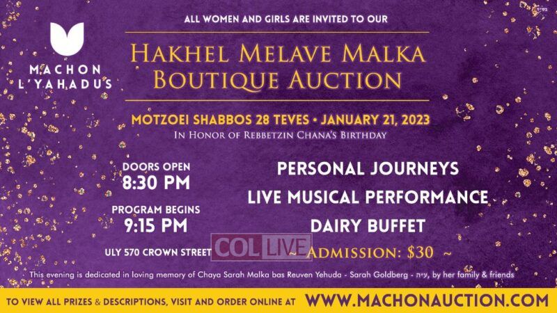 The Hakhel Boutique Auction Melave Malka is taking place Motzei Shabbos, 28 Teves, January 21 at United Lubavitcher Yeshiva, 570 Crown Street. Doors open at 8:30 pm and the program begins at 9:15 pm.