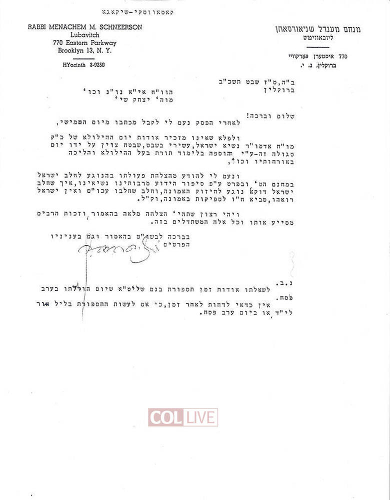 In the letter from the Rebbe dated 16 Shvat, 6722 that is attached below, the Rebbe states that he was pleased to hear about Mr. Kosofsky’s success with cholov Yisrael. In the postscript, the Rebbe responds to his question about when to make an upsherenish for his son, whose birthday is erev pesach. The Rebbe advises him to cut the boy’s hair on the birthday, either the night before or by day, and not to push it off.