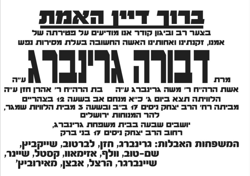 She is survived by her children: Rabbi Naftali Greenberg of Lod, Israel; Mrs. Rochel Levertov of Austin, Texas; Rabbi Yisroel Greenberg of El Paso, Texas; Mrs. Esther Shaikevitz of Kfar Chabad, Israel; Rabbi Yoske Greenberg of Anchorage, Alaska; Rabbi Zushe Greenberg of Solon, Ohio; Rabbi Chaim Greenberg of Beitar, Israel; Mrs. Bassie Shemtov of Brooklyn, New York; Rabbi Shalom Greenberg of Shanghai, China; Mrs. Chaya Wolff of Odessa, Ukraine; Mrs. Rivka Azimov of Paris, France; Rabbi Schneor Greenberg of Commerce, Michigan; Rabbi Shmulik Greenberg of Vancouver, Washington; Mrs. Shterni Wolff of Hannover, Germany; Rabbi Baruch Greenberg of Vista, California; Rabbi Avraham Greenberg of Pudong, China, and Mrs. Chava Kastel of Bnei Brak, Israel; grandchildren and great-grandchildren.