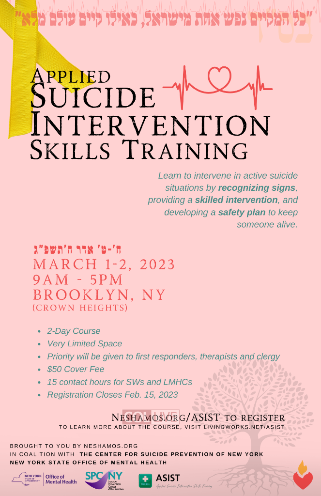 Neshamos.org, a mental health organization set in the heart of Crown Heights, has shouldered the responsibility of addressing this very need. For the second year in a row, Neshamos has teamed up with SPCNY, Suicide Prevention Center of New York from the office of mental Health, to bring the ASIST Workshop to our very own community. ASIST, the Assisted Suicide Intervention Skills Training Workshop, is a 2 day intensive program that covers all grounds when it comes to matters of suicide. This program provides it all- ranging from education on the motivation to commit this act; the risk factors involved; how to spot out signs of someone who may be contemplating suicide; and ultimately- how to immediately and competently intervene in moments of danger, G-d forbid.