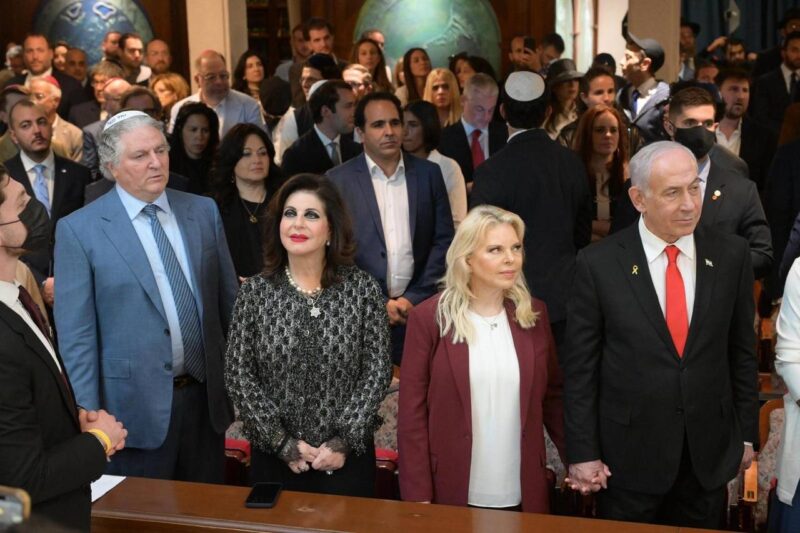 Netanyahu arrived at the shul with his wife, Sara Netanyahu, in the afternoon for an exclusive reception that included government officials and prominent donors. Among them was Simon Falic, chairman of Duty Free Americas.