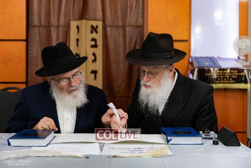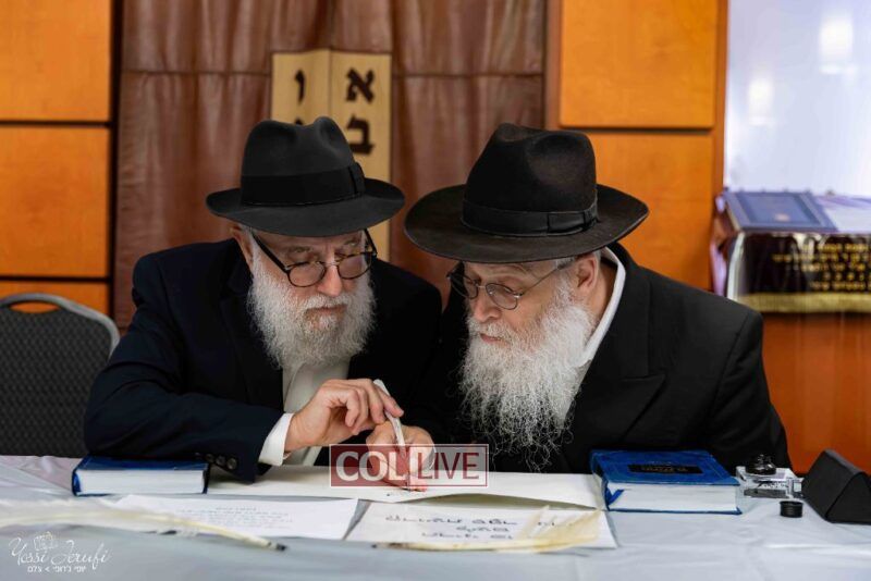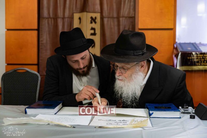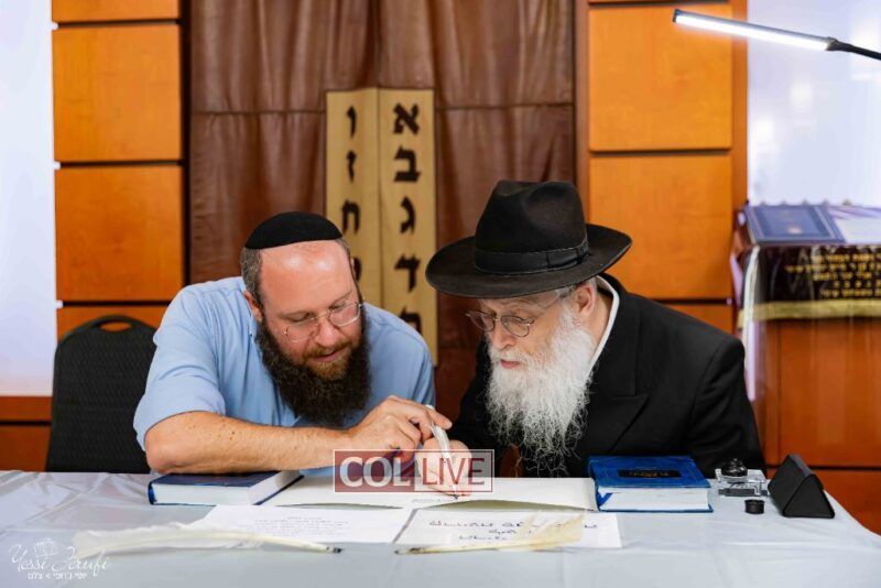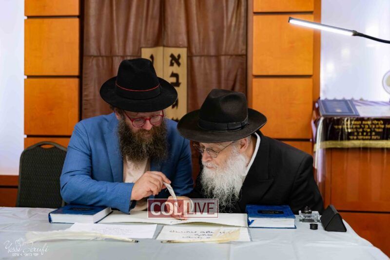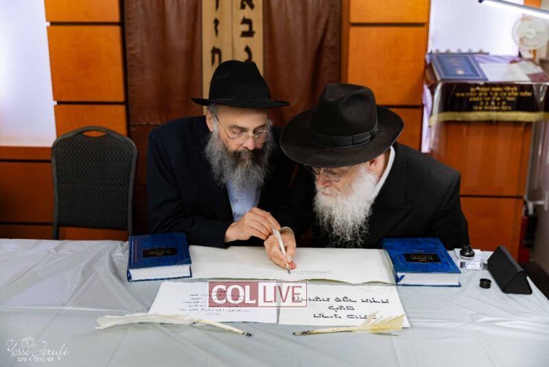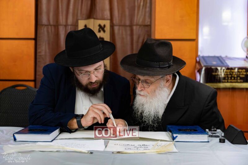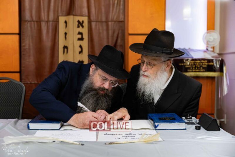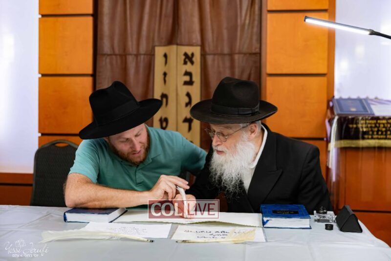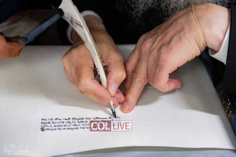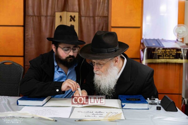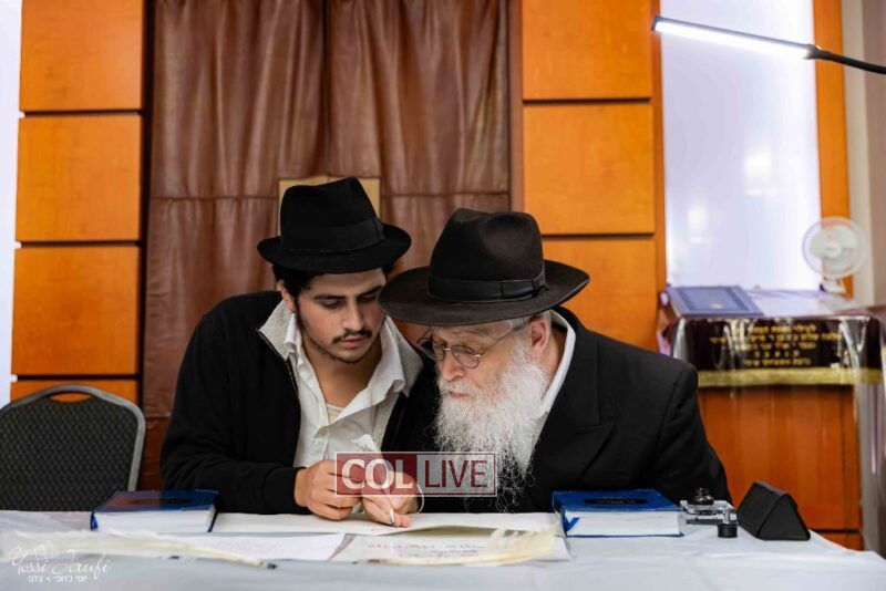 The beginning of the Sefer Torah writing took place in Beis Gimpel Shul, where Rabbi Shloimy Greenwald serves as Rov, gives daily shiurim, and leads the Kolel L’Horaah Ma’asis.