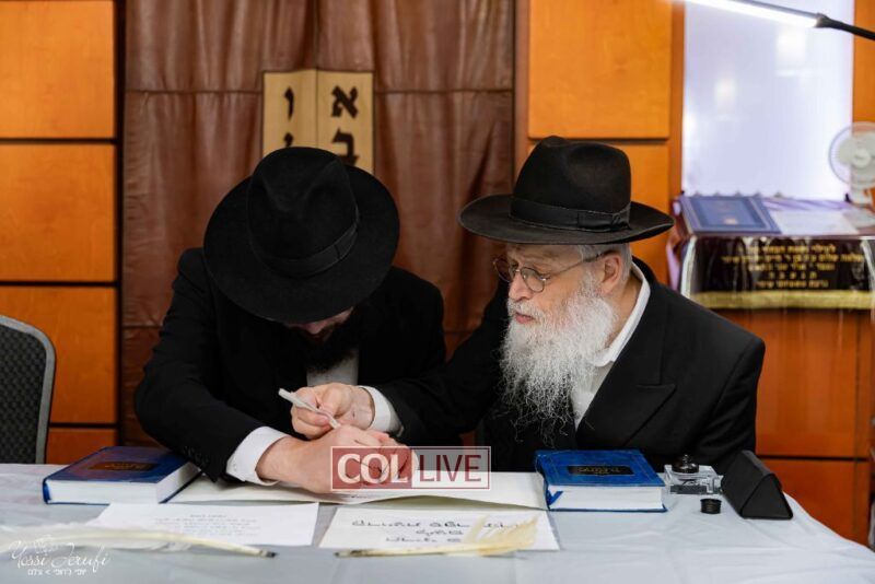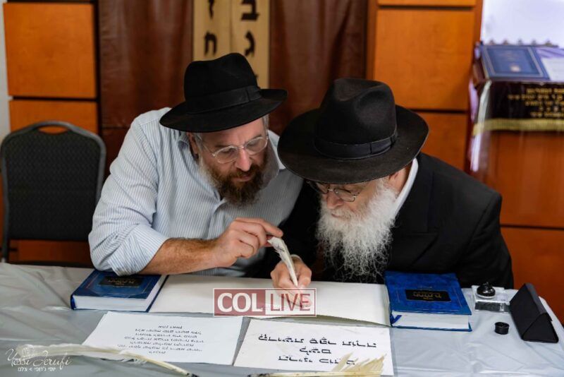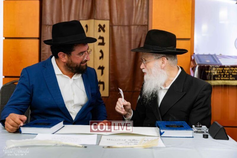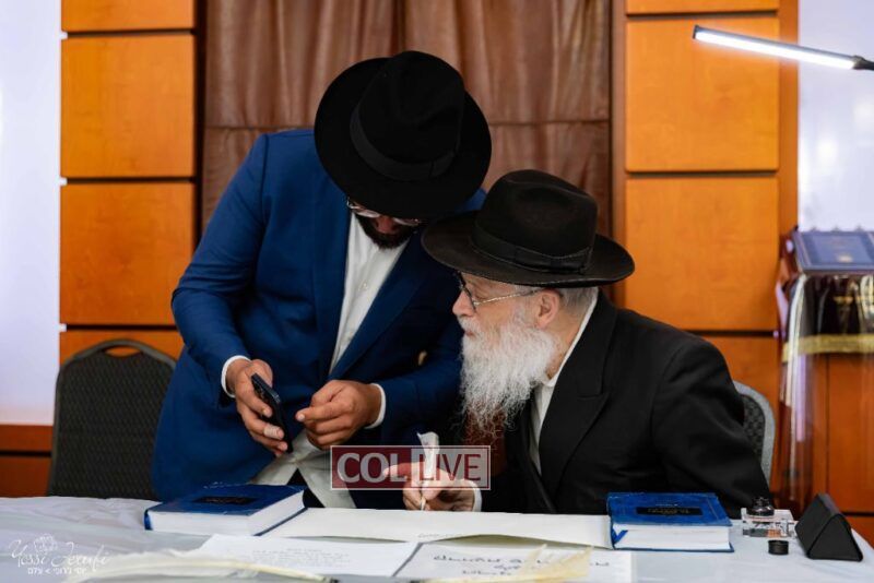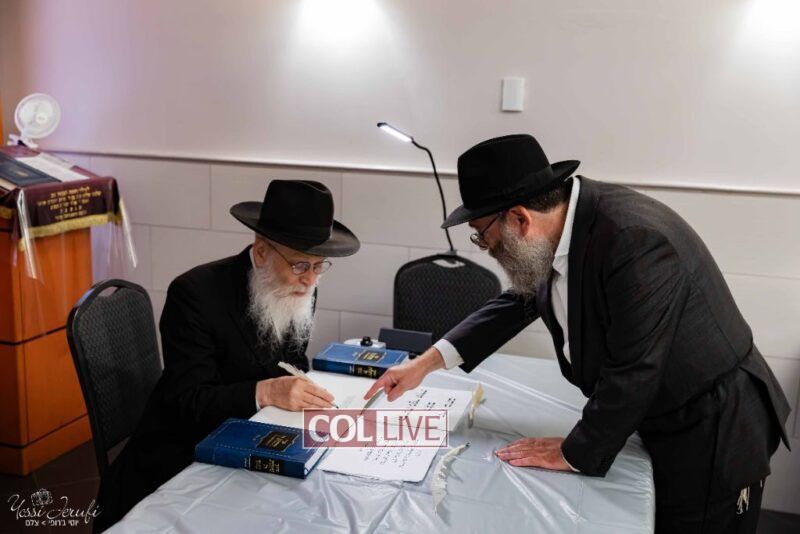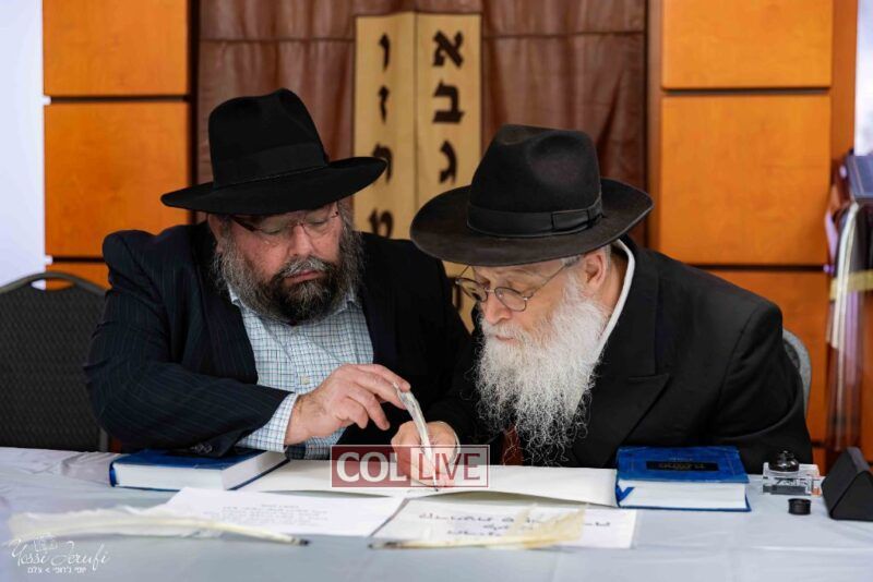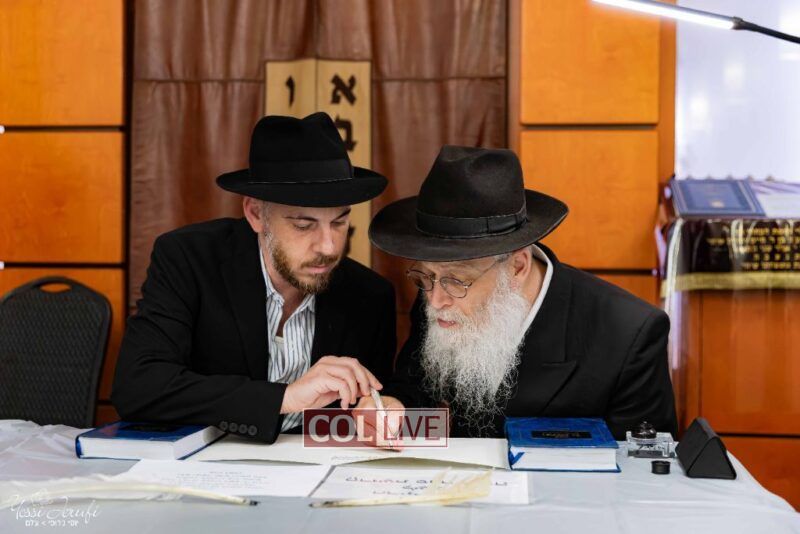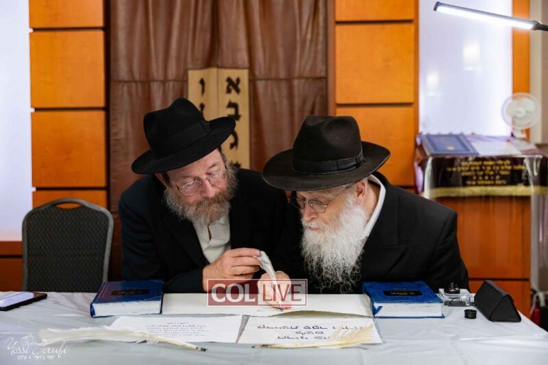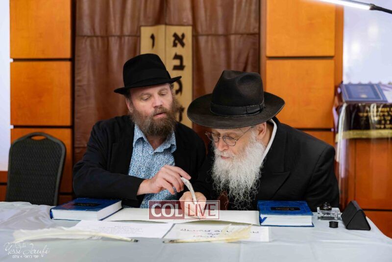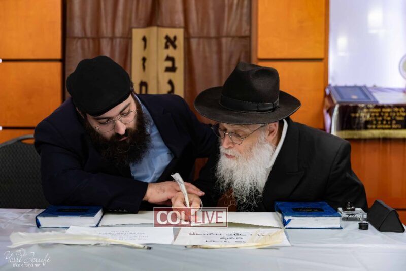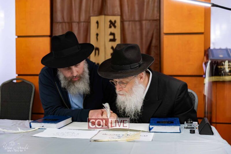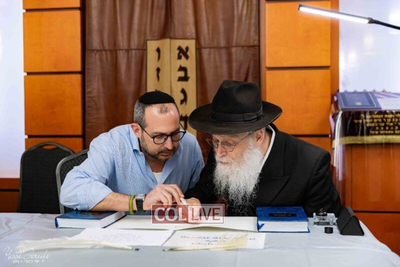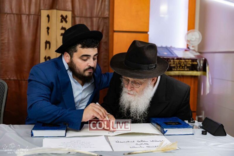 The beginning of the Sefer Torah writing took place in Beis Gimpel Shul, where Rabbi Shloimy Greenwald serves as Rov, gives daily shiurim, and leads the Kolel L’Horaah Ma’asis.