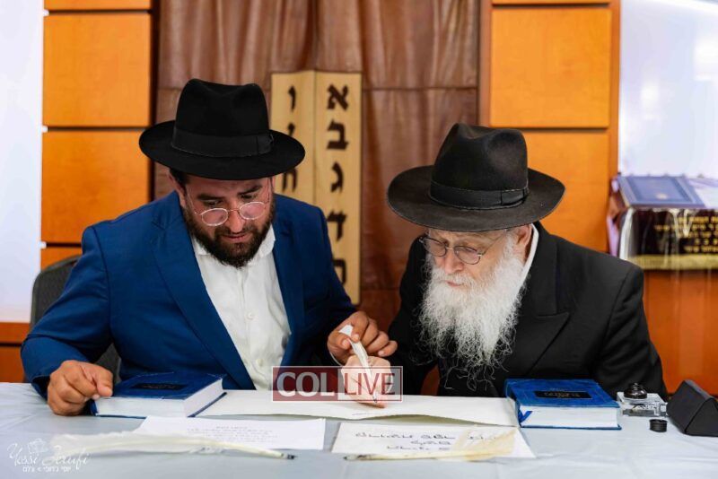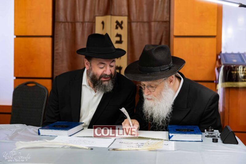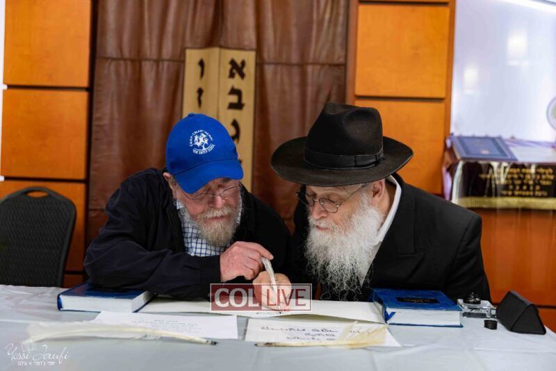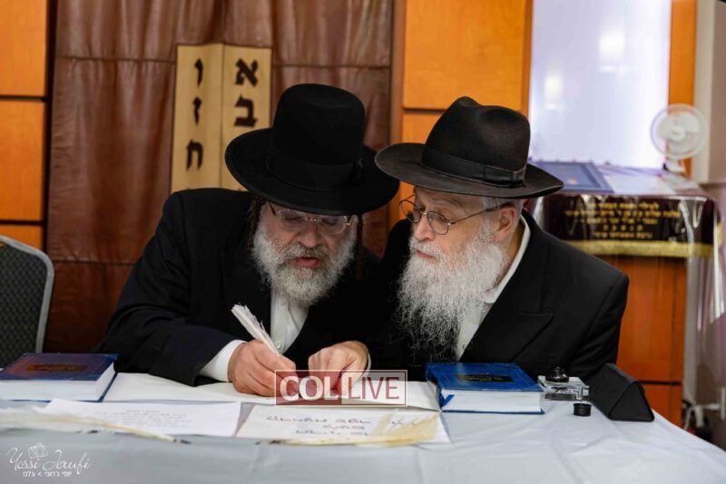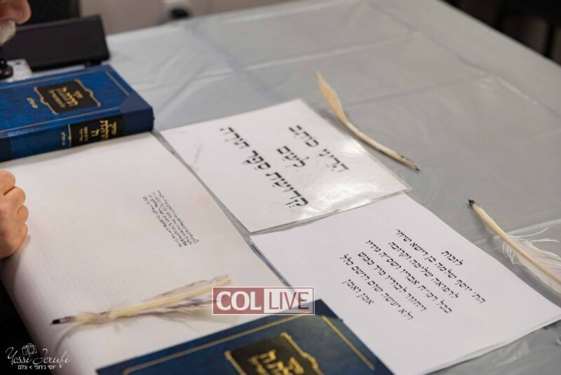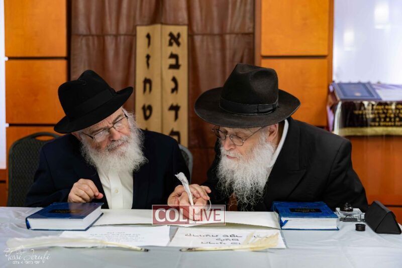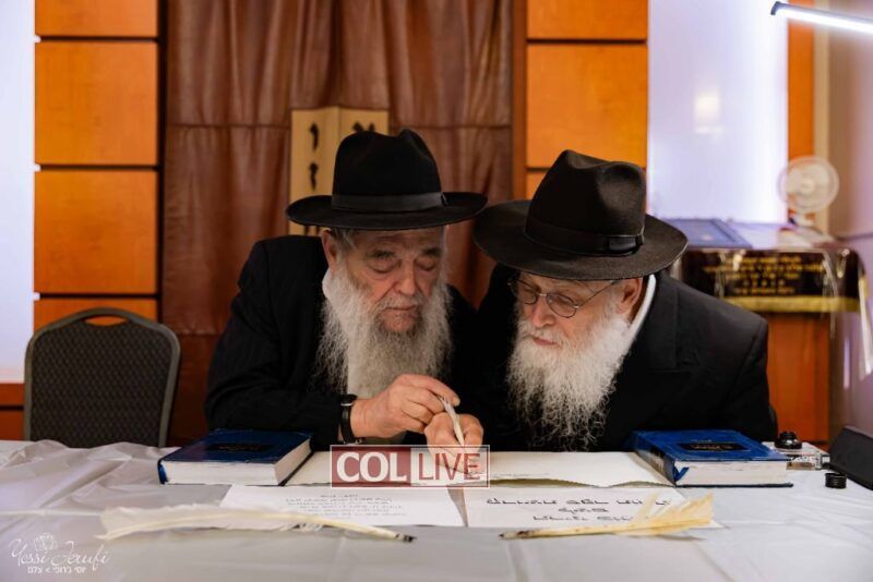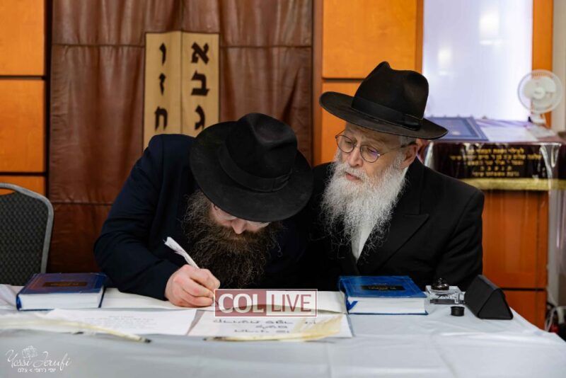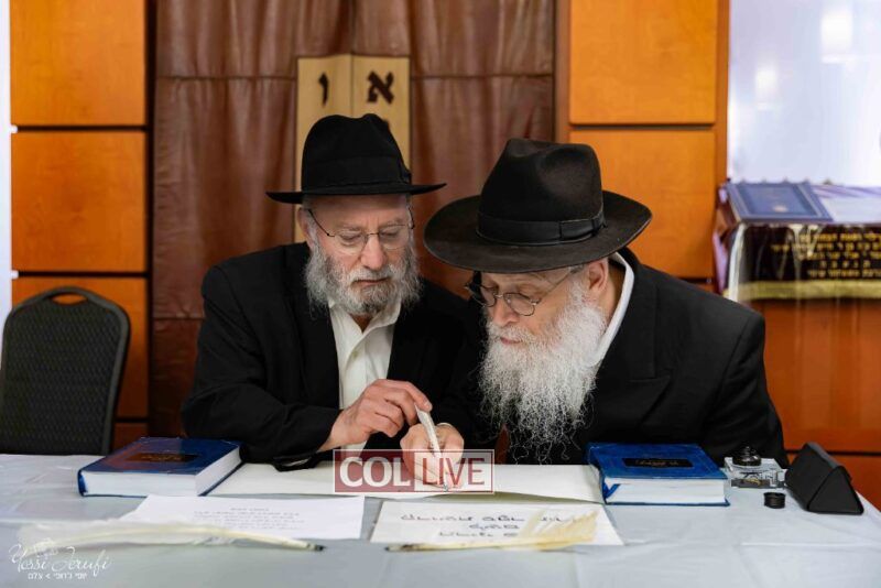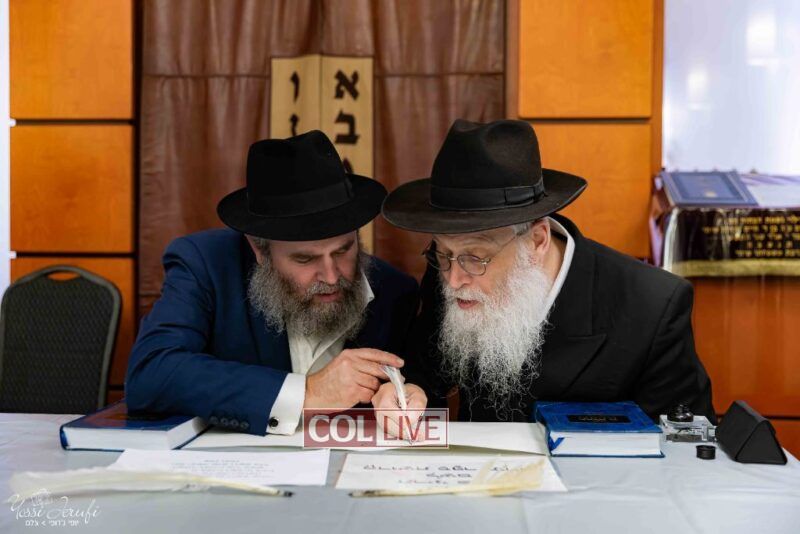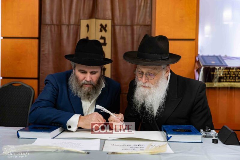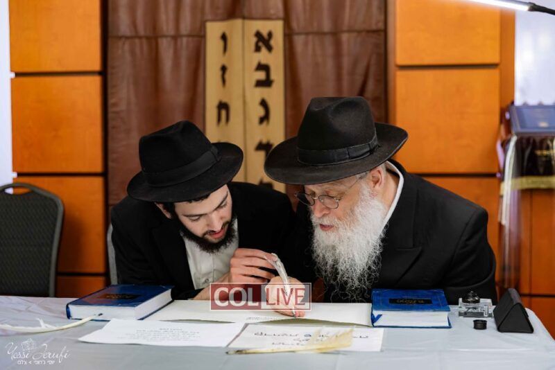 The beginning of the Sefer Torah writing took place in Beis Gimpel Shul, where Rabbi Shloimy Greenwald serves as Rov, gives daily shiurim, and leads the Kolel L’Horaah Ma’asis.