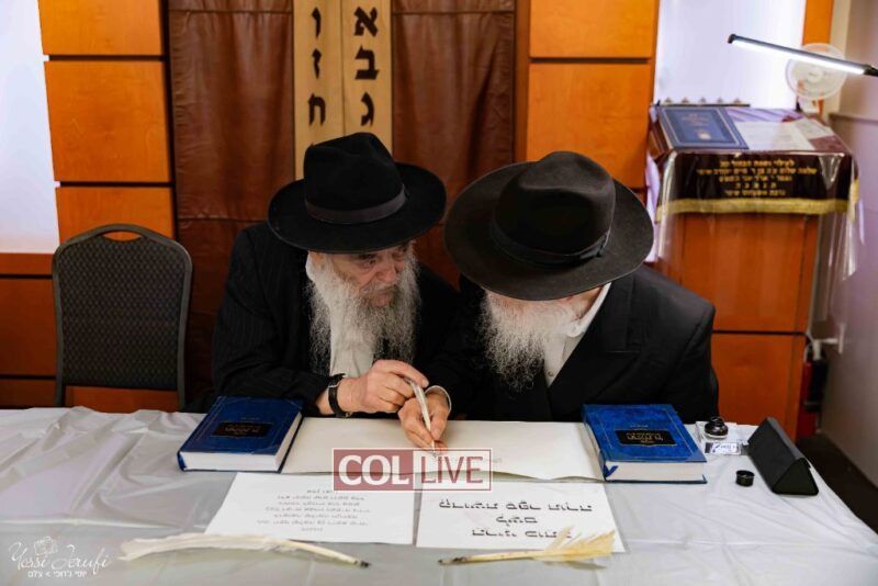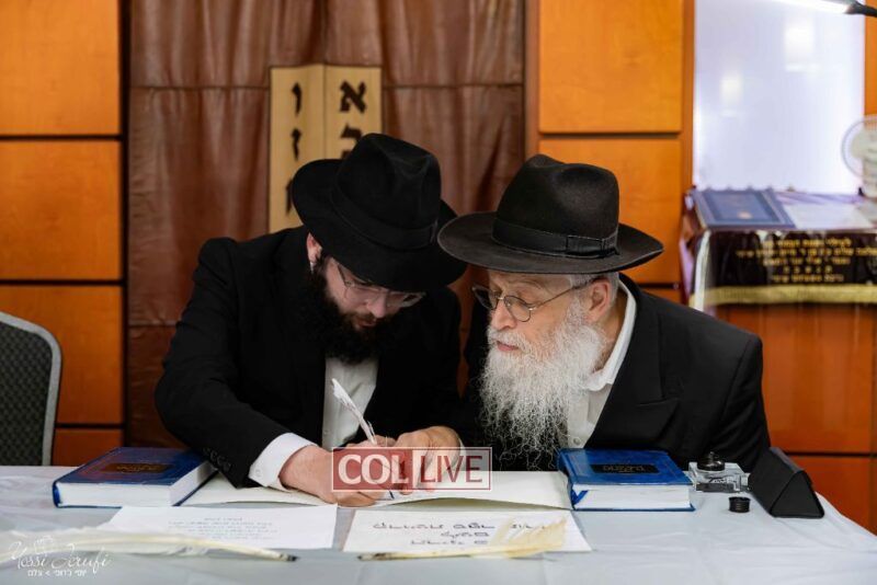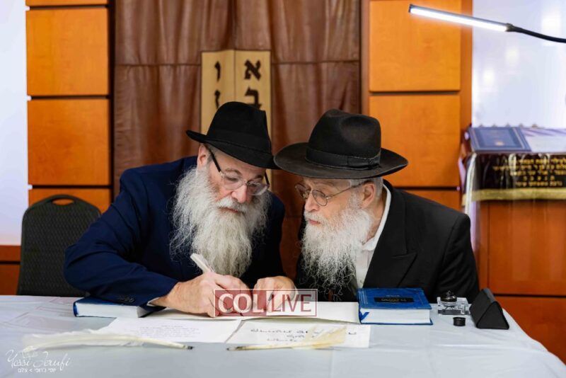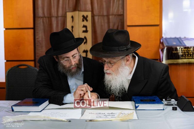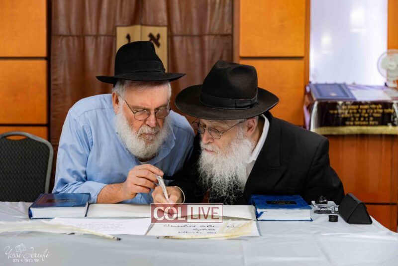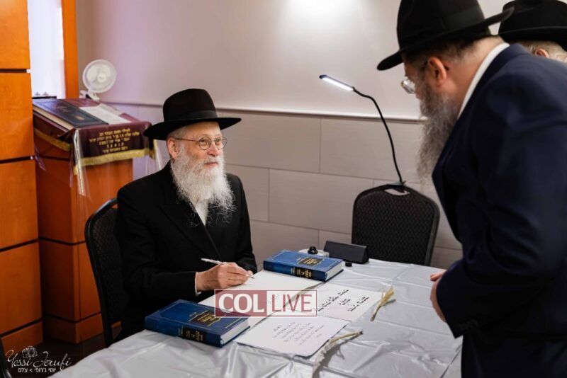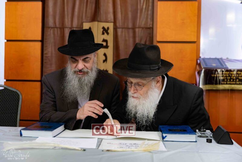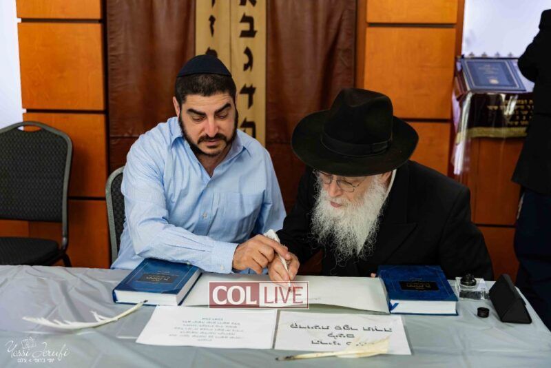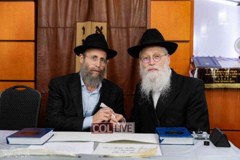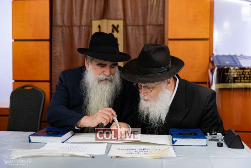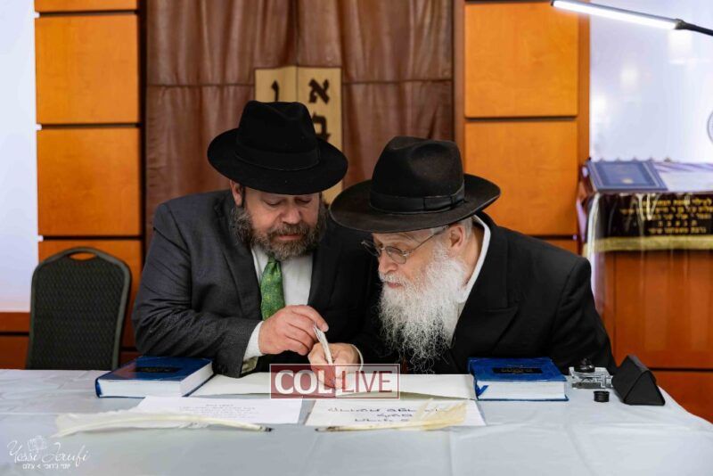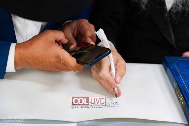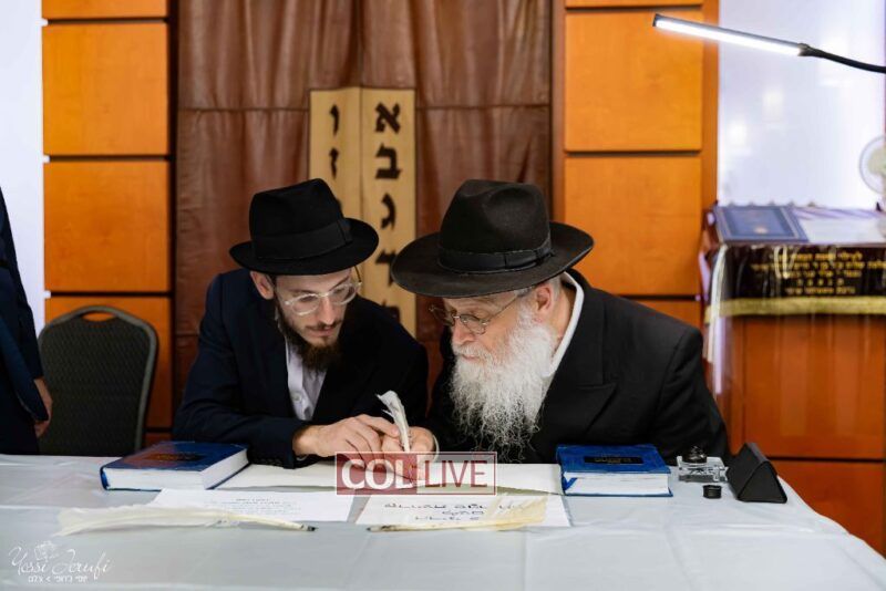 The beginning of the Sefer Torah writing took place in Beis Gimpel Shul, where Rabbi Shloimy Greenwald serves as Rov, gives daily shiurim, and leads the Kolel L’Horaah Ma’asis.