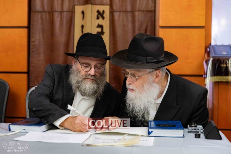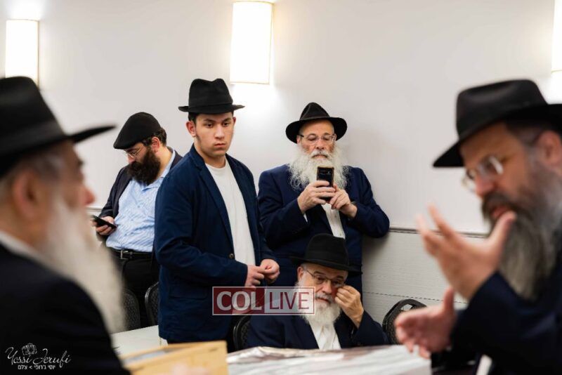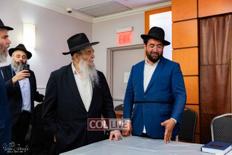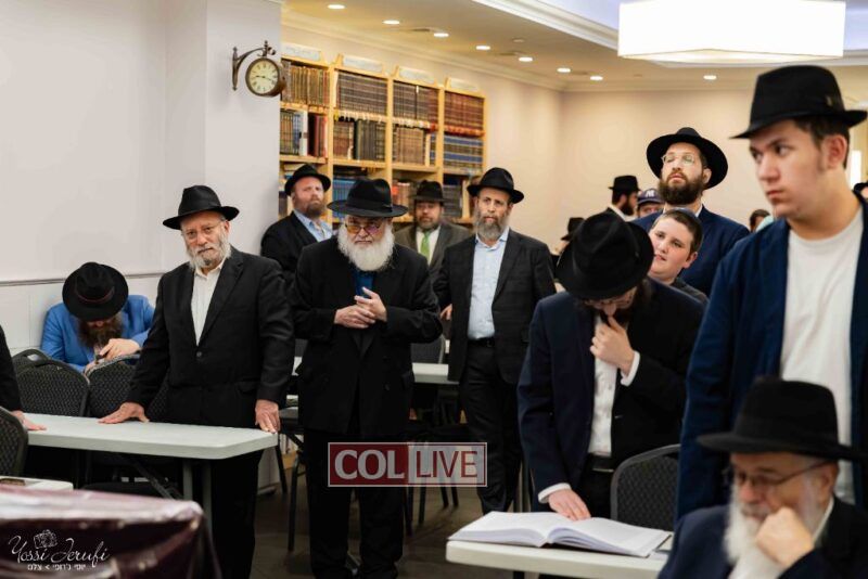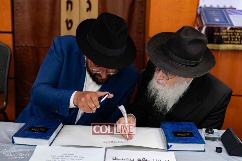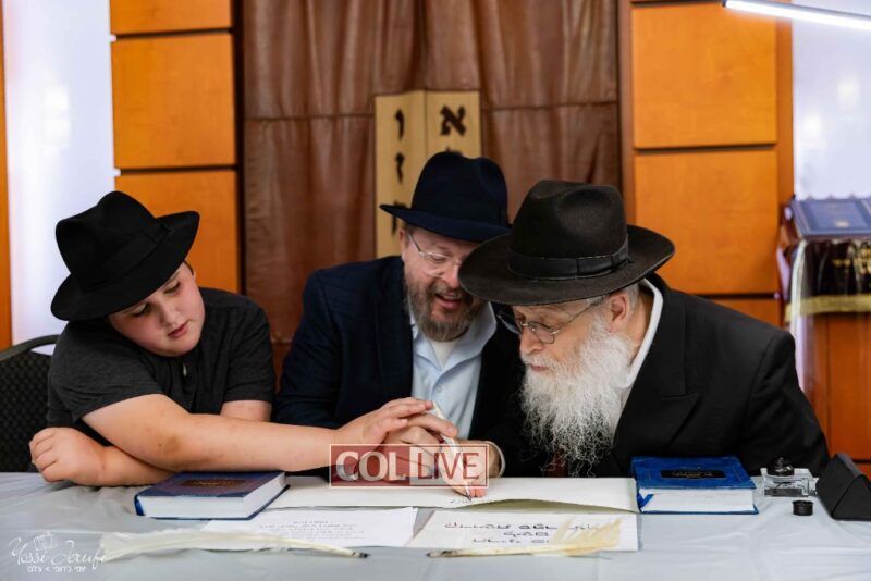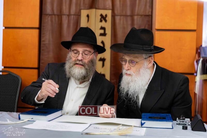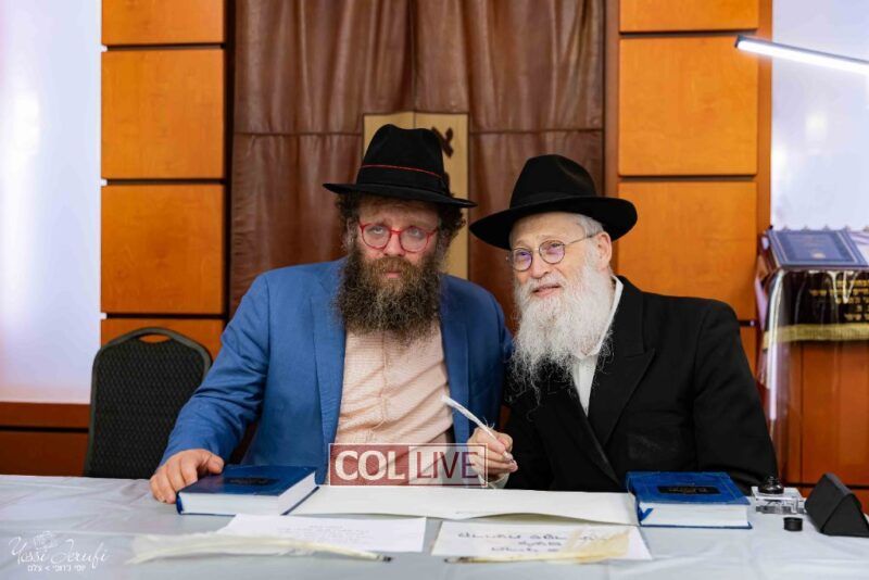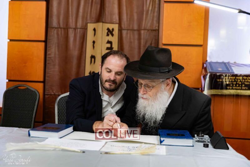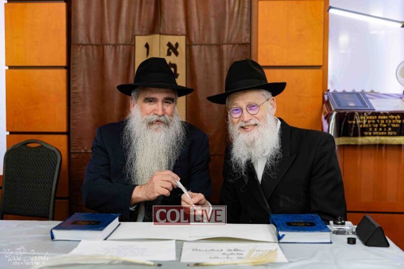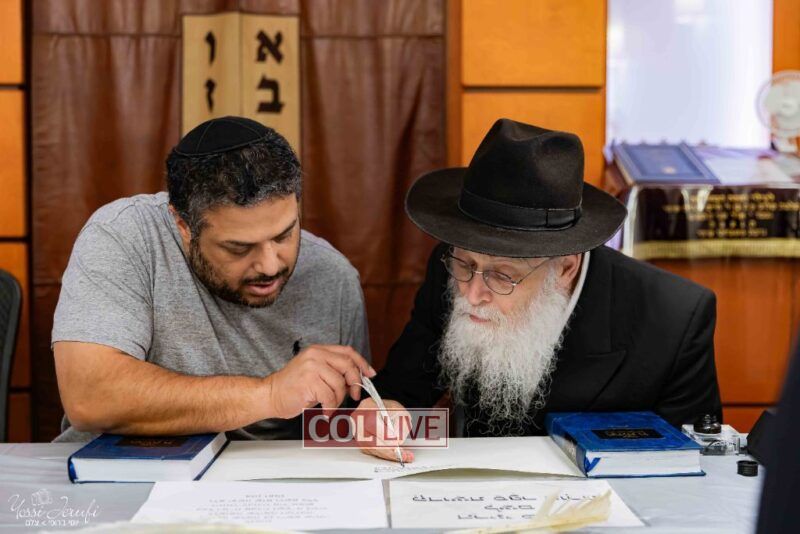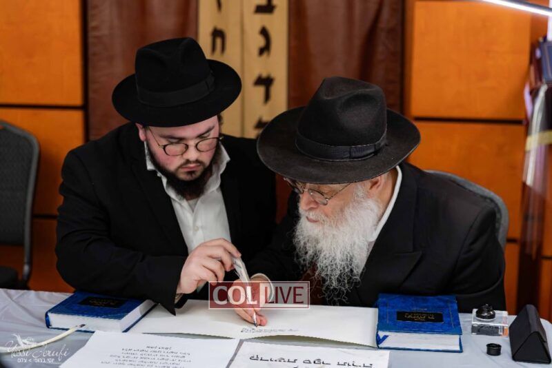 The beginning of the Sefer Torah writing took place in Beis Gimpel Shul, where Rabbi Shloimy Greenwald serves as Rov, gives daily shiurim, and leads the Kolel L’Horaah Ma’asis.