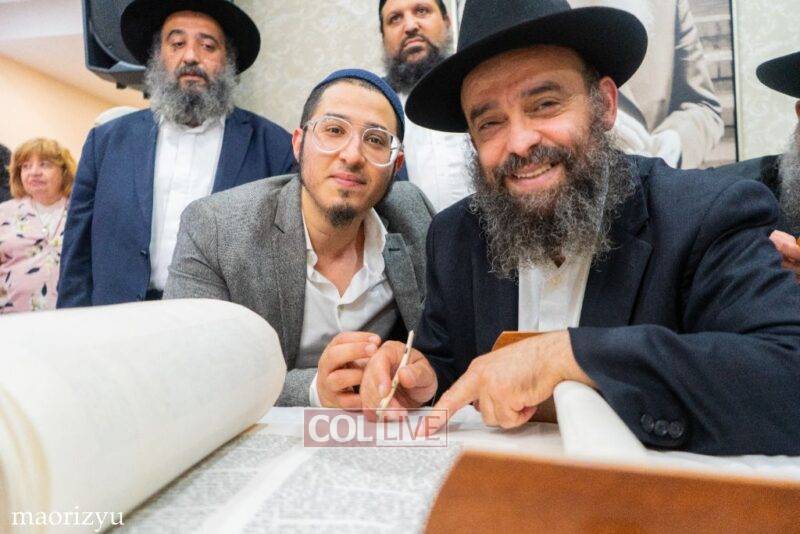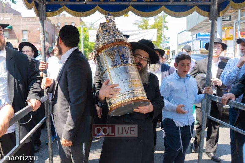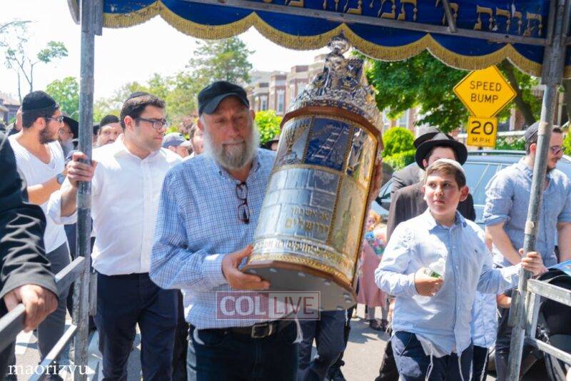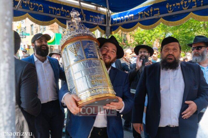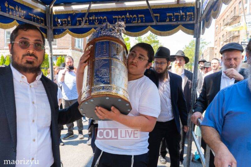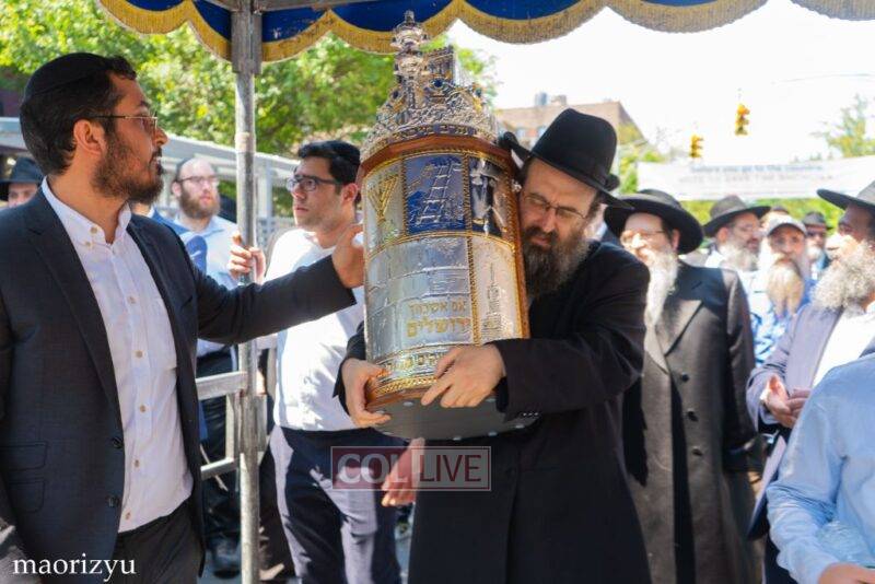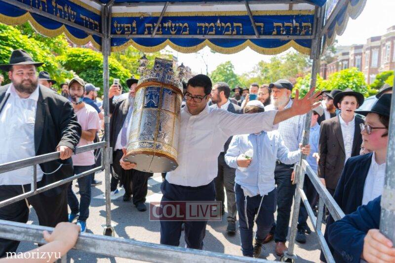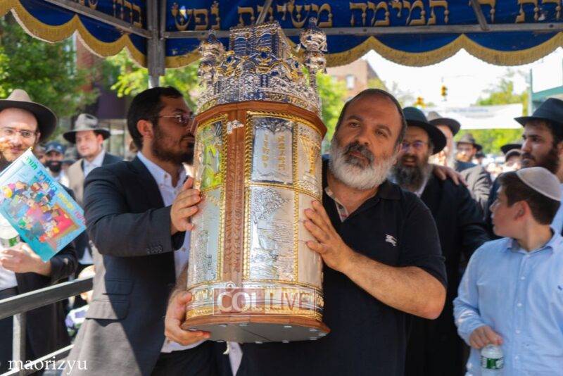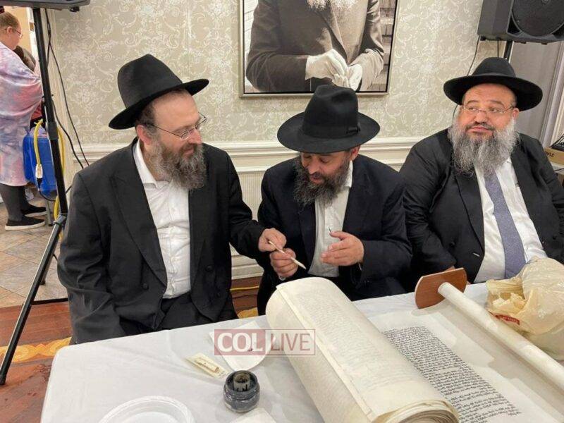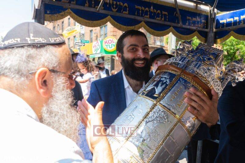 After the completion of the final letters, the Torah was led with singing and dancing to Rabbi Nimni’s Shul and Kolel at 560 Empire Blvd.