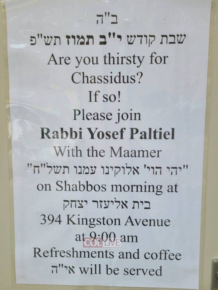 In lieu of a large Farbrengen, a special Chassidus shiur to take place Shabbos morning before Davening at Beis Eliezer Yitzchok Shul, with noted Mashpia and lecturer, Rabbi Yossi Paltiel. All anash and temimim are invited to join.