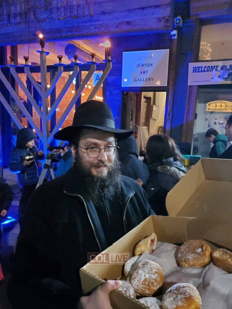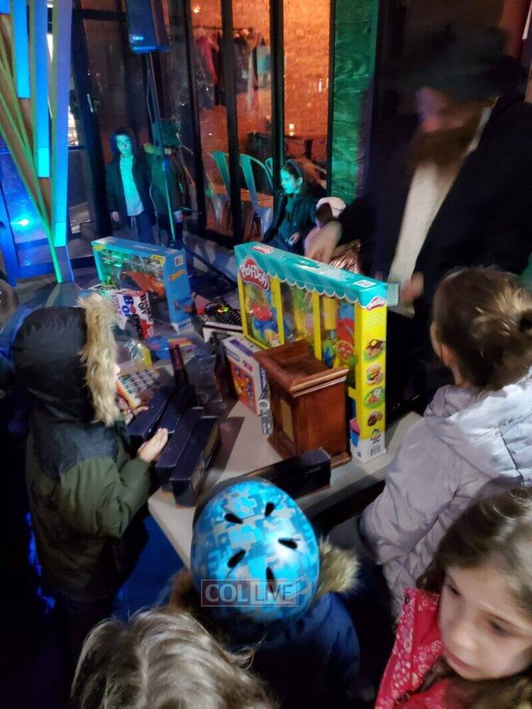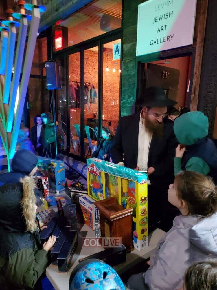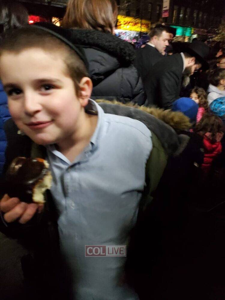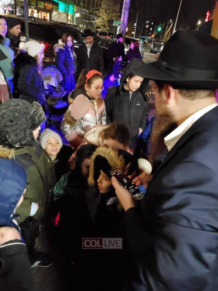 A crowd gathered on Kingston Avenue in front of the Leviim gallery for the lighting, enjoying donuts and prizes for the children.