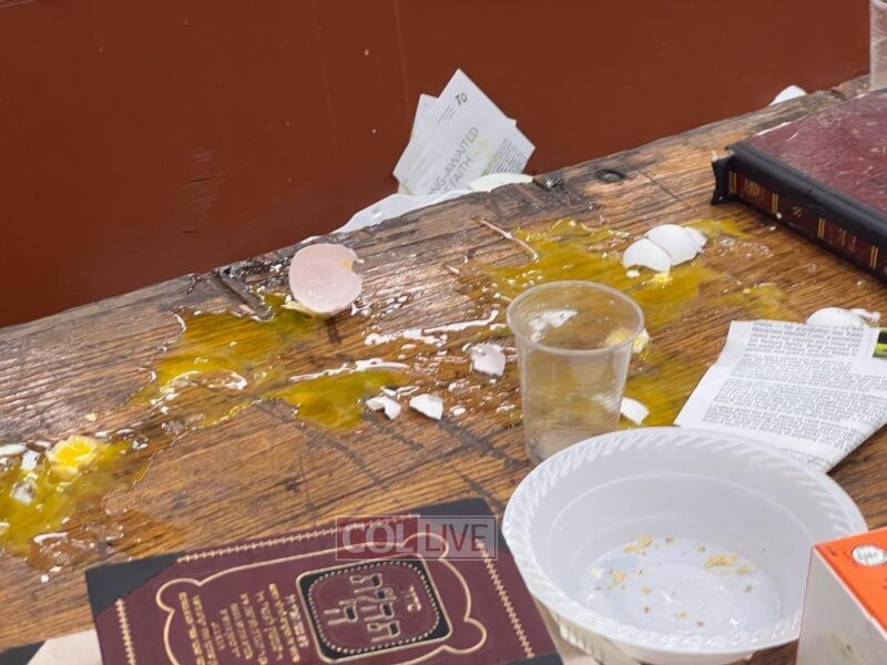 The youngsters, who wore face masks, threw raw eggs at participants of the shiur presented by Rabbi Shmuel Avtzon, 770 Mashpia, Rov of Bais Moshe Shul and Director of Sichos in English.