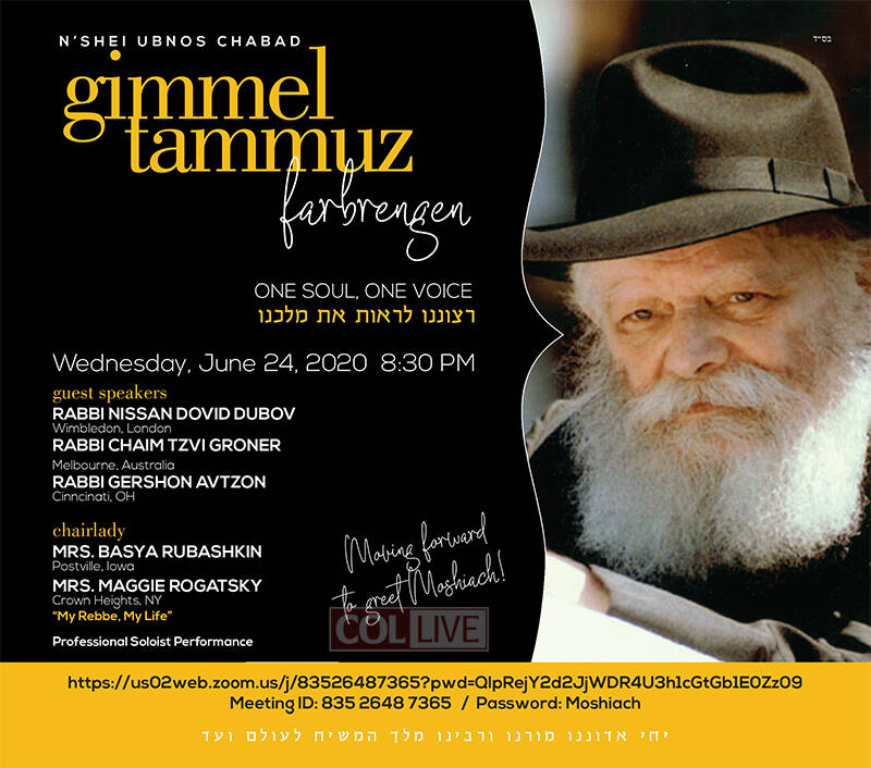 N’Shei Ubnos Chabad will hold their annual Gimmel Tammuz Farbrengen, live online.