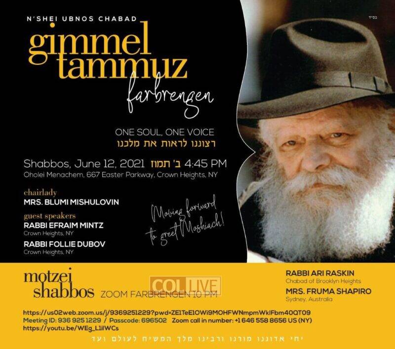Join N’Shei U’bnos Chabad on motzei shabbos at 10:00 PM NY time in honor of Gimmel Tammuz