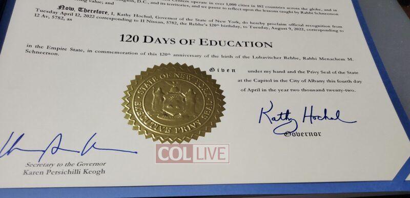 The Governor of the state of New York, Kathy Hochul proclaimed “120 Days of Education” in the State of New York in honor of the One Hundred and Twentieth Birthday of the Rebbe.