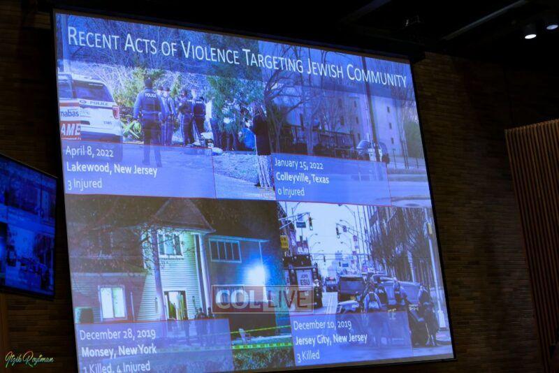 The photo of the slide with “Recent Acts of Violence Targeting Jewish Community” does show recent acts of violence.