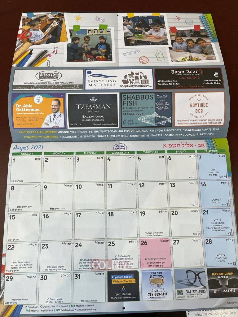 Since its inception 19 years ago, the calendar’s unique large format and appealing style have made it a calendar of choice for Jewish households in Crown Heights and beyond. The calendar includes Yomim Tovim, various Z’manim, and Chassidishe dates, as well as the Yeshiva schedule.