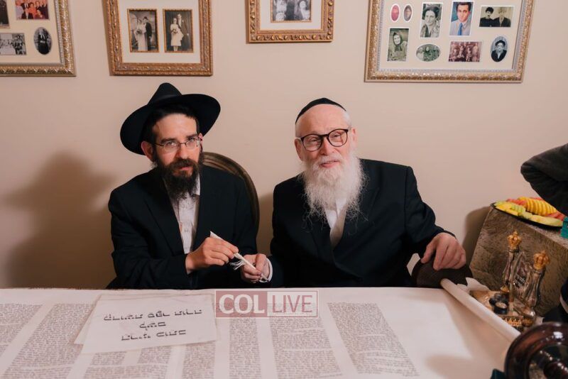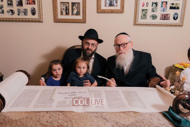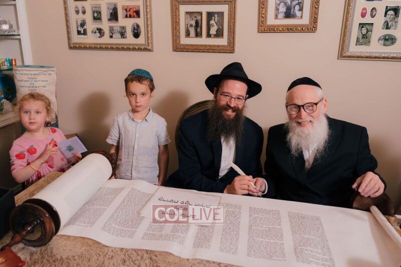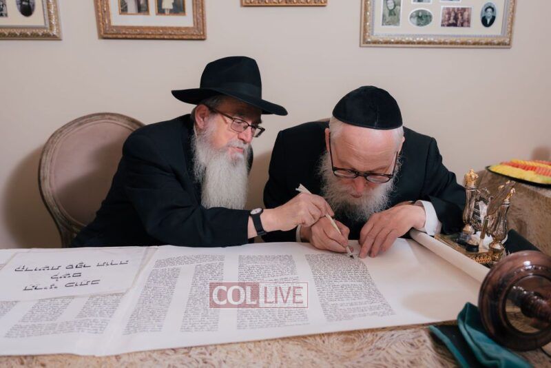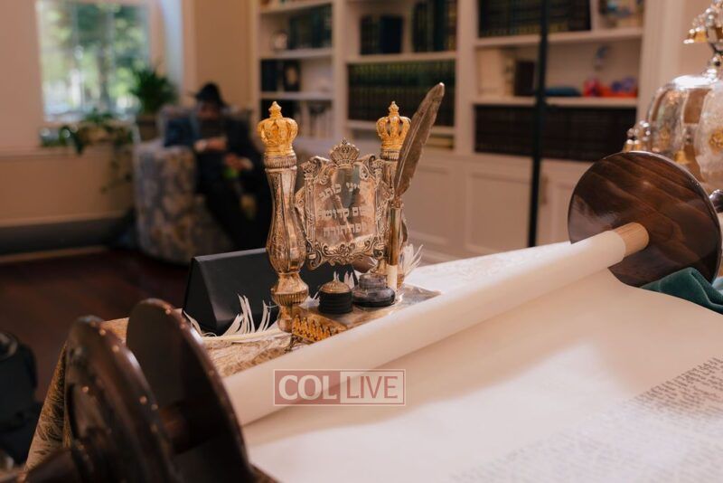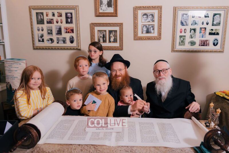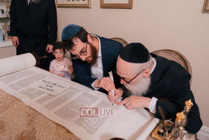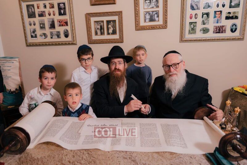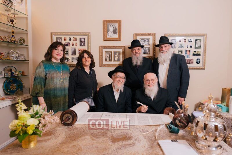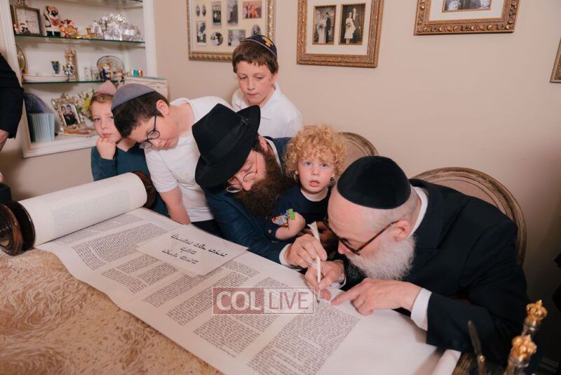 The gathering began at the Blumes residence, where sofer Rabbi Moshe Klein guided and assisted all those who wrote the final letters. From there, the sefer Torah was passed from person to person, and everyone present had the opportunity to hold and share in this momentous occasion. The Sefer Torah was then brought to Oholei Torah, where it will be utilized by the talmidim.