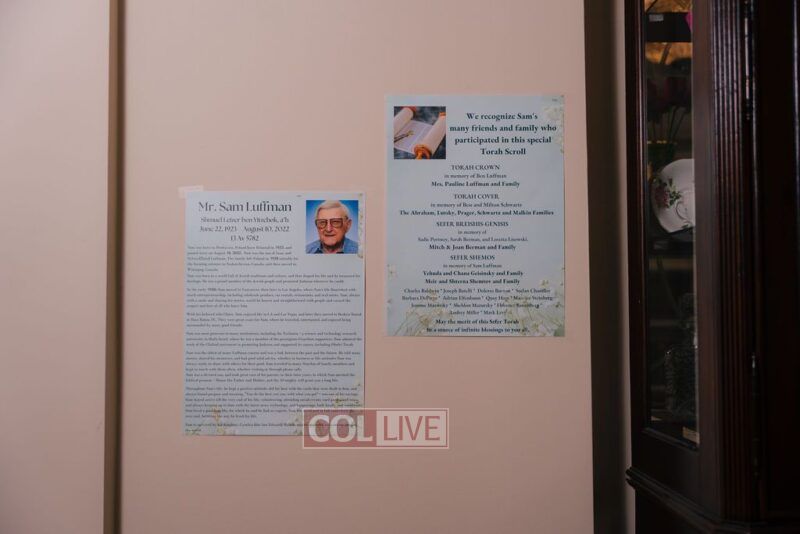 The funds to secure this sefer Torah were provided in memory of Mr. Sam Luffman, Shmuel Leizer ben Yitzchok, may his memory be a blessing. Mr. Luffman was a relative of the Blumes family and a supporter of Oholei Torah. He passed away earlier this year.