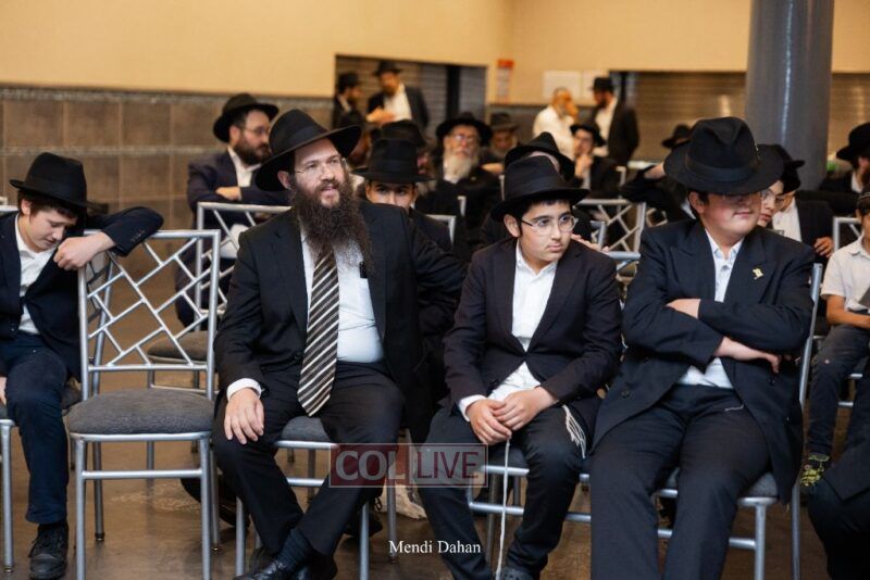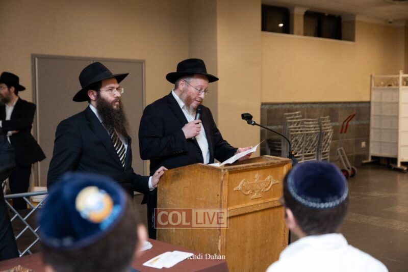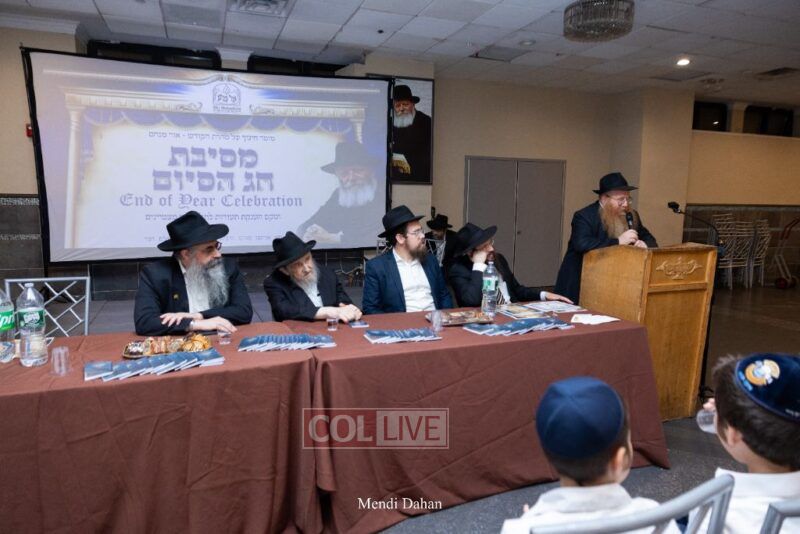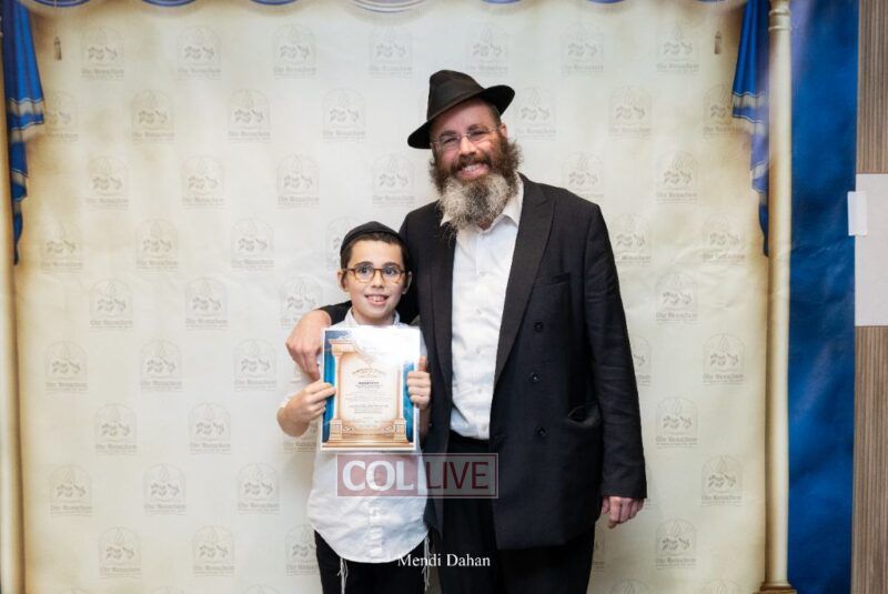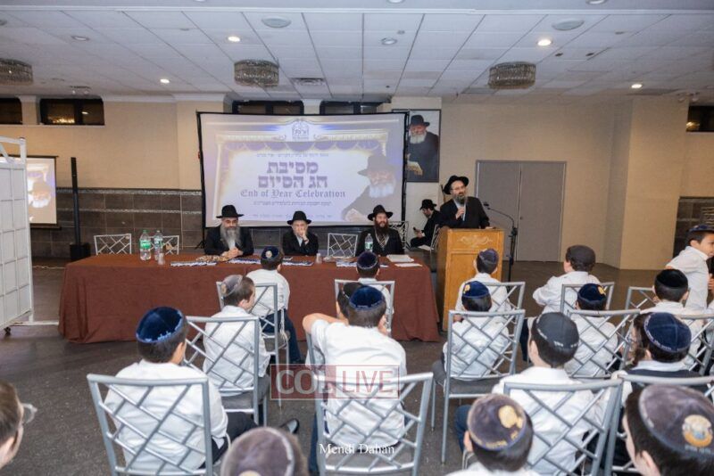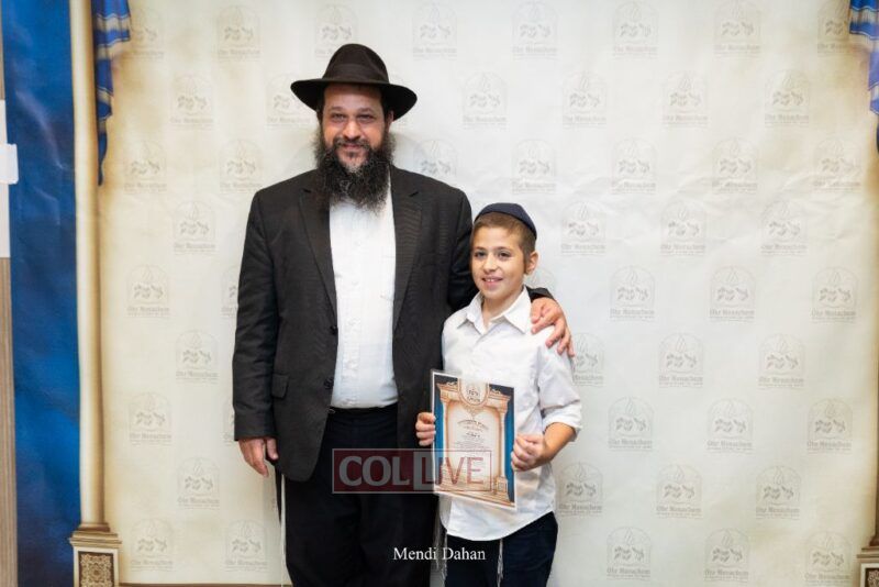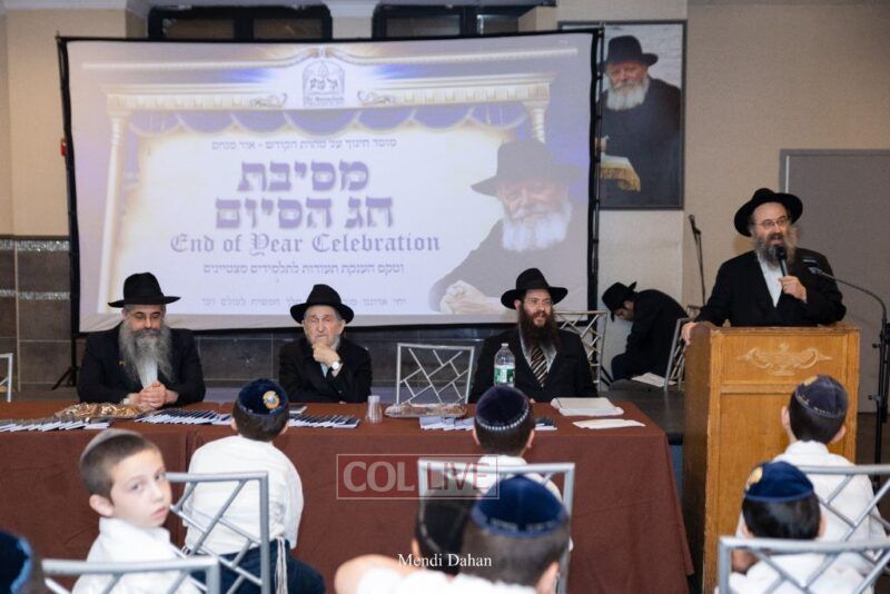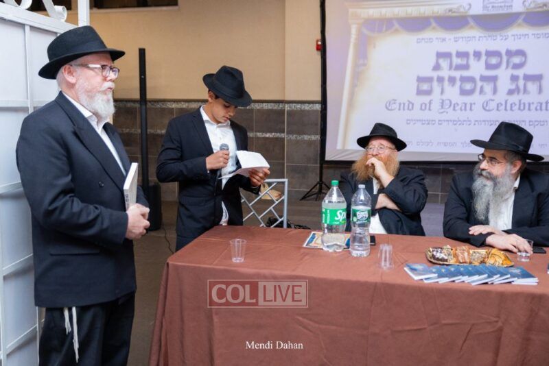 The emcee invited Rabbi Itche Mishulovin to lead the Rebbe’s Kappitel, followed by Birkas Cohanim from Rabbi Mendel Hendel, Menahel Kloli of Ohr Menachem and its continuum of mosdos. Rabbi Mendel Yusewitz, Menahel, expressed joy at completing a year of true growth, marked by tremendous Limud HaTorah, Kiyum Mitzvot B’Simcha, and middos tovos. He presented each student with their end-of-year certificate, highlighting the unique praise (Shevach) chosen by their Melamed to define their individual light and contribution to the class.