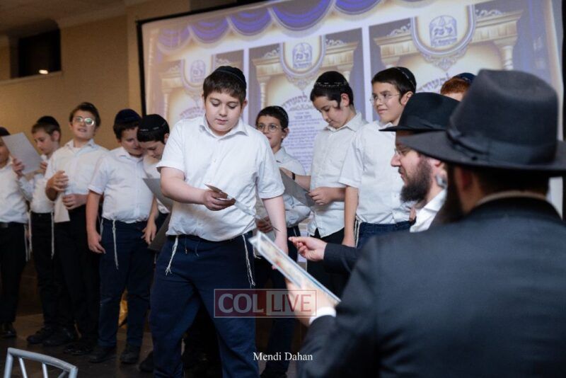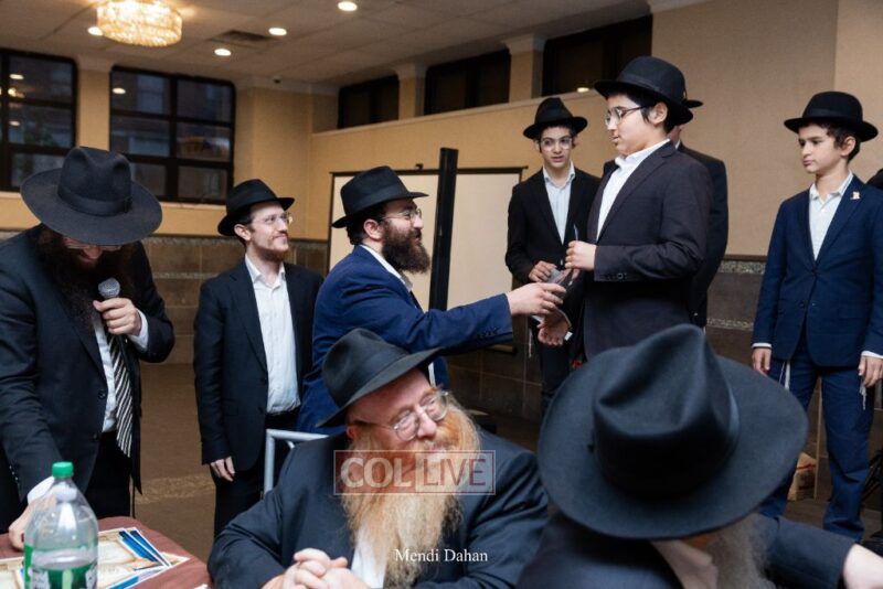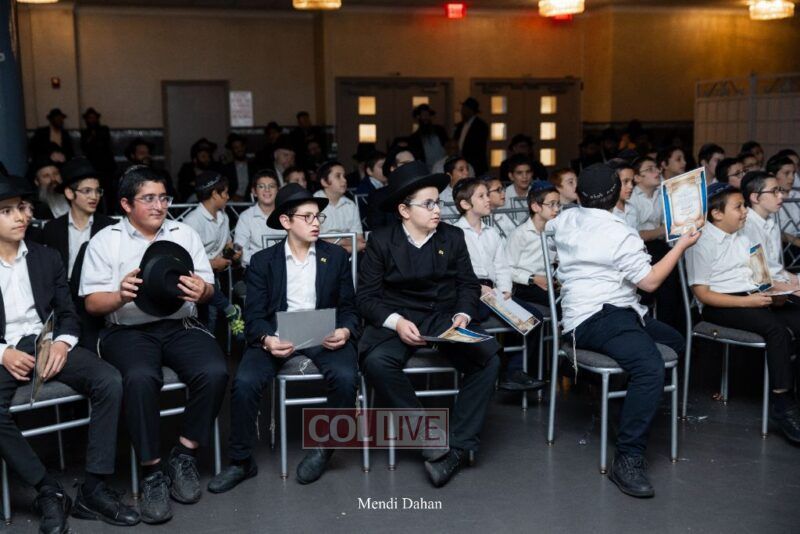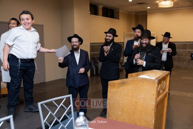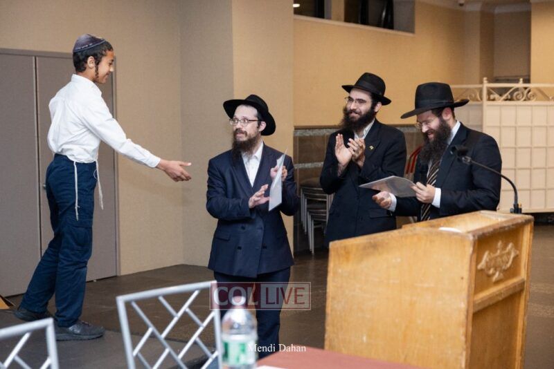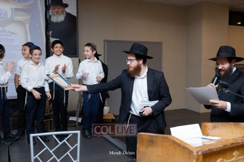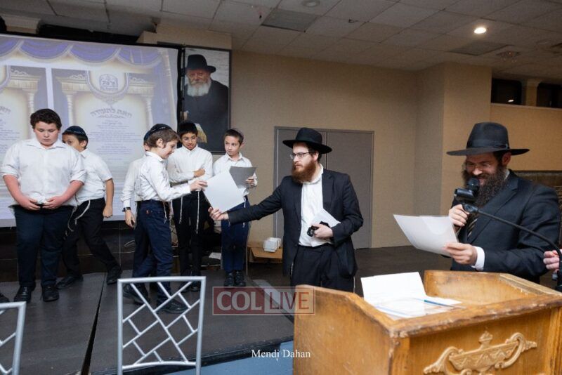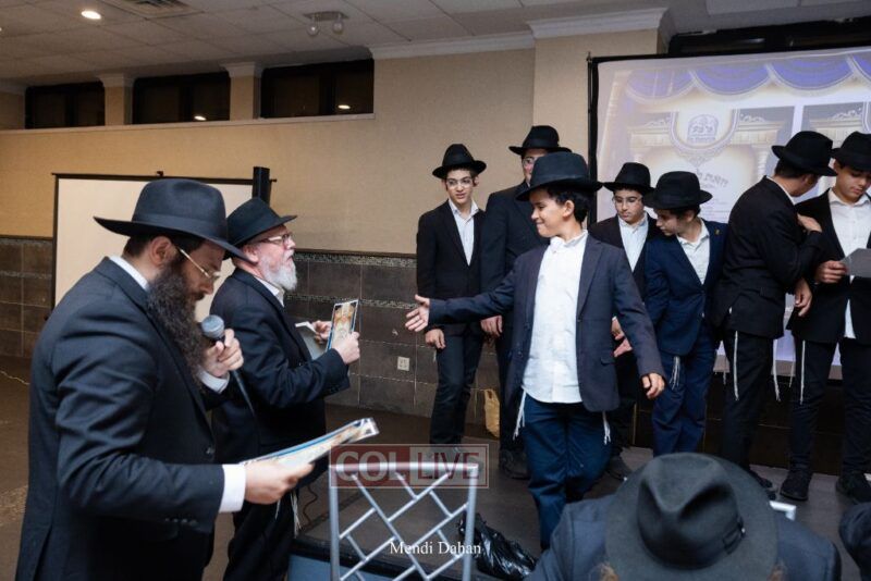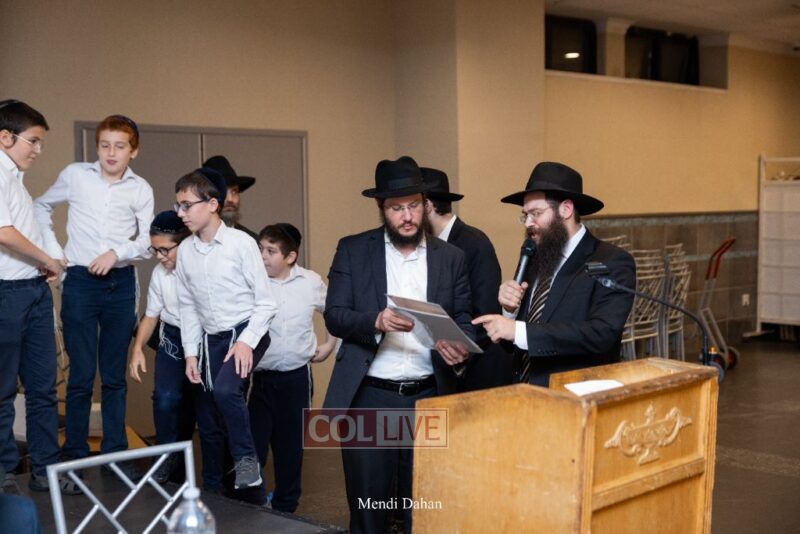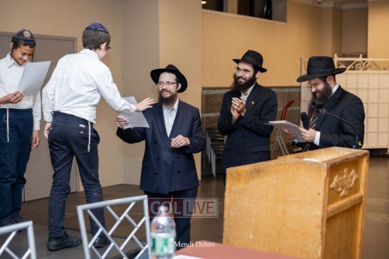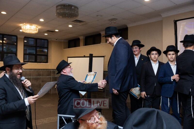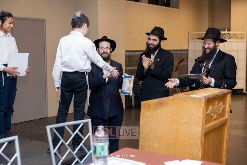 Rabbi Yossef Overlander, vice principal, awarded special Seforim vouchers to students who excelled in Mishnayos Baal Peh. The Menahel presented each student with a beautiful Cheder “Mincha Maariv” gift, thanking Hashem publicly for the privilege of working with a unique and special team of educators. He also thanked the event producers, Rabbi Avrohom Rainitz, Rabbi Chanoch Hecht, and Reb Shlomo Frishman.