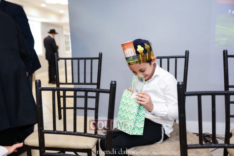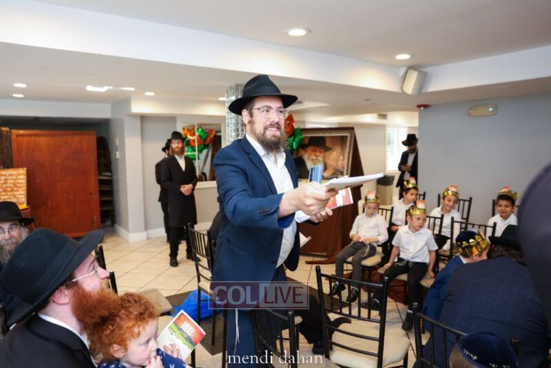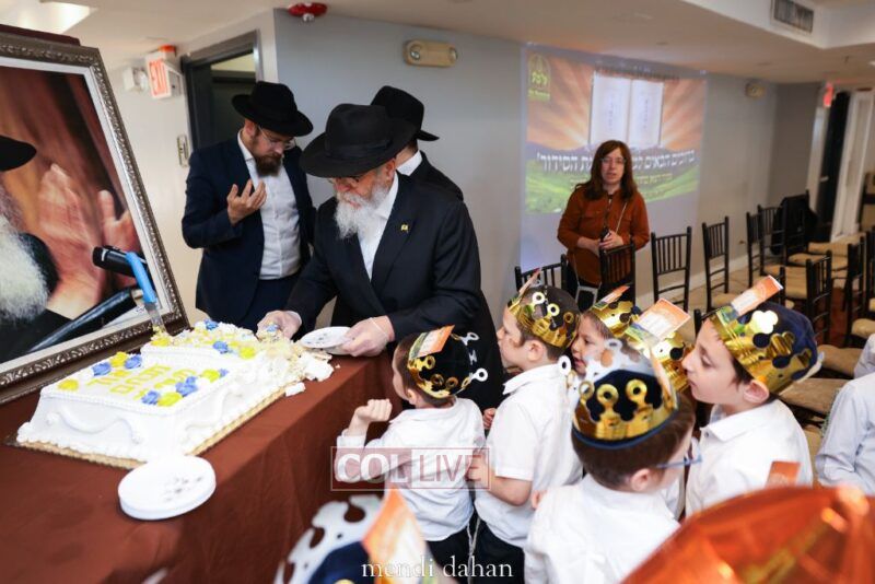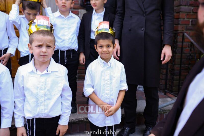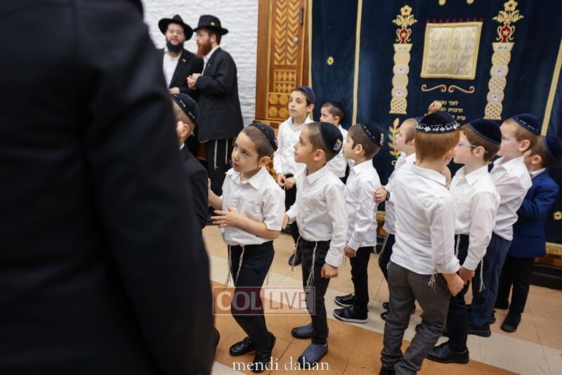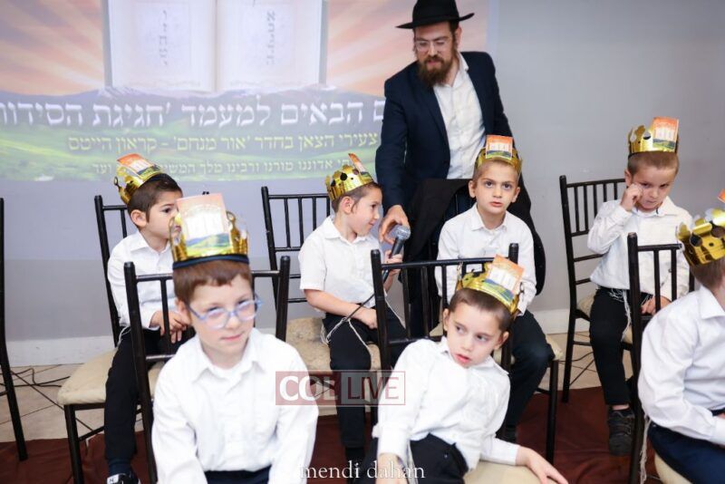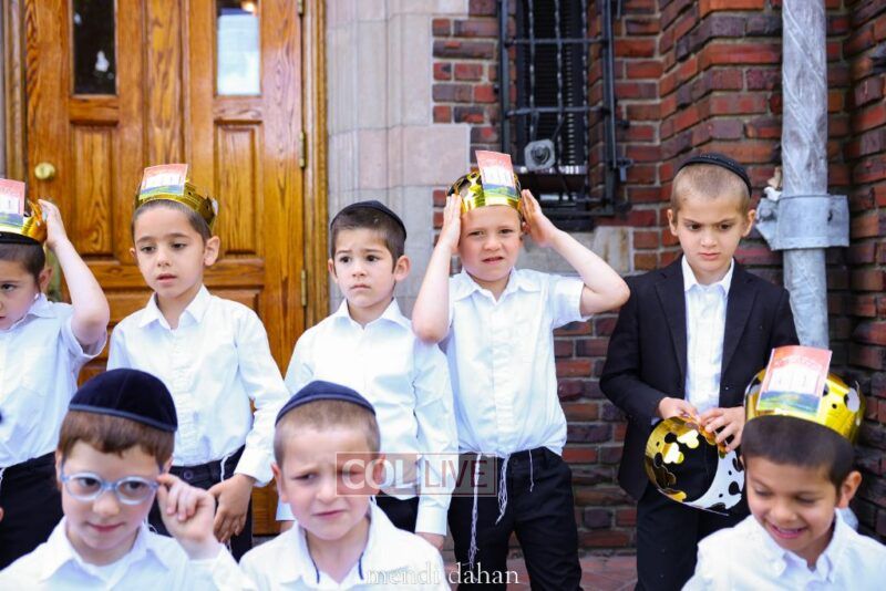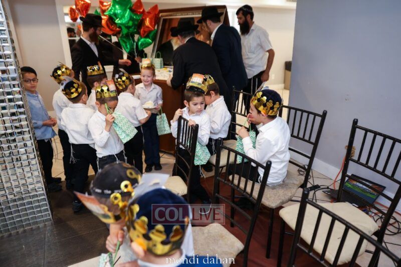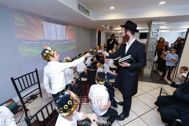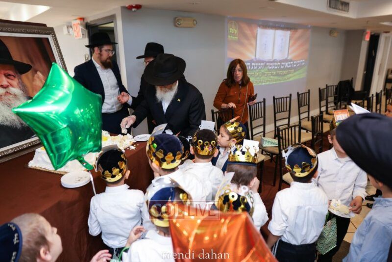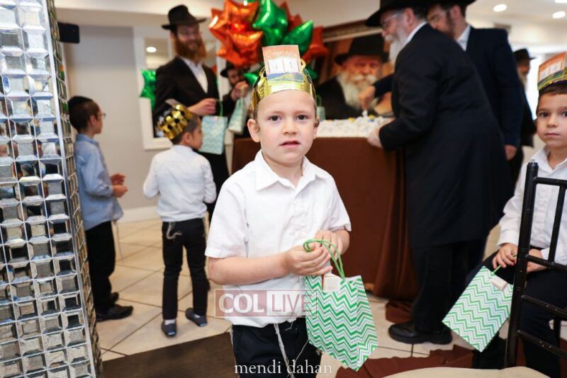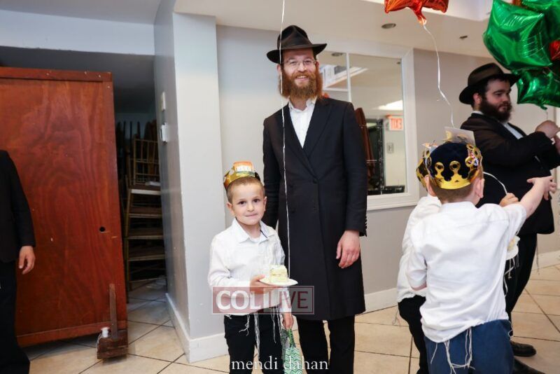 The children then received Birkas Kohanim from the Menahel Hamosdos Rabbi Menachem Mendel Hakohen Hendel, followed by singing and dancing. Each student was presented with their very own Siddur and a special cake from their Melamed.