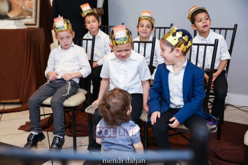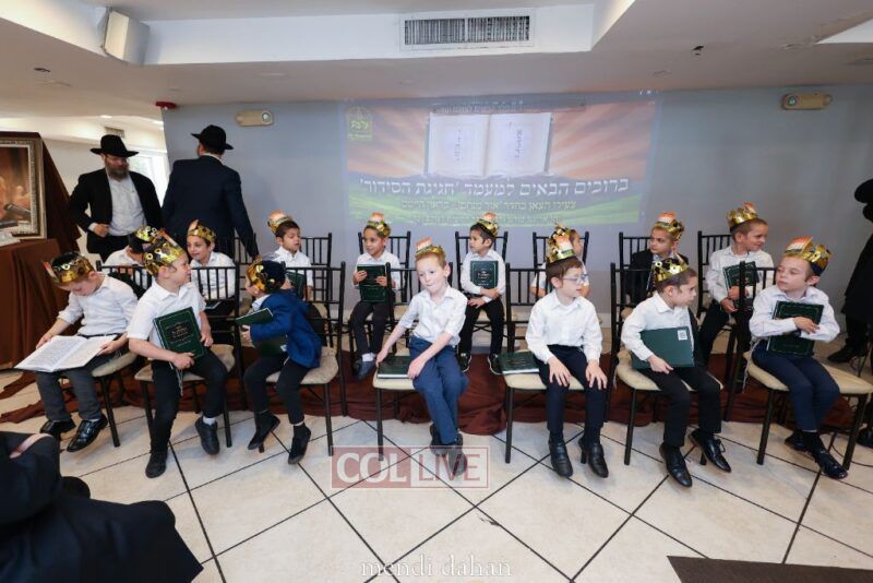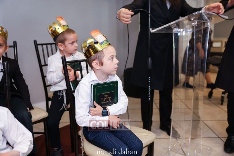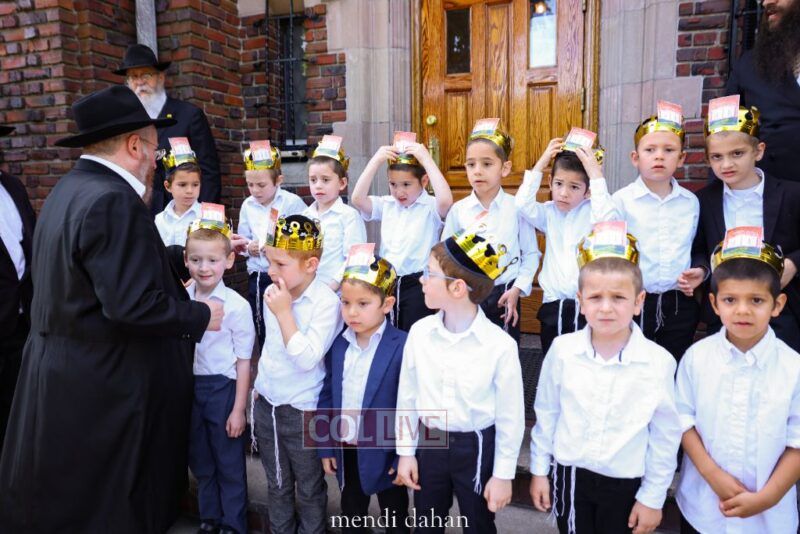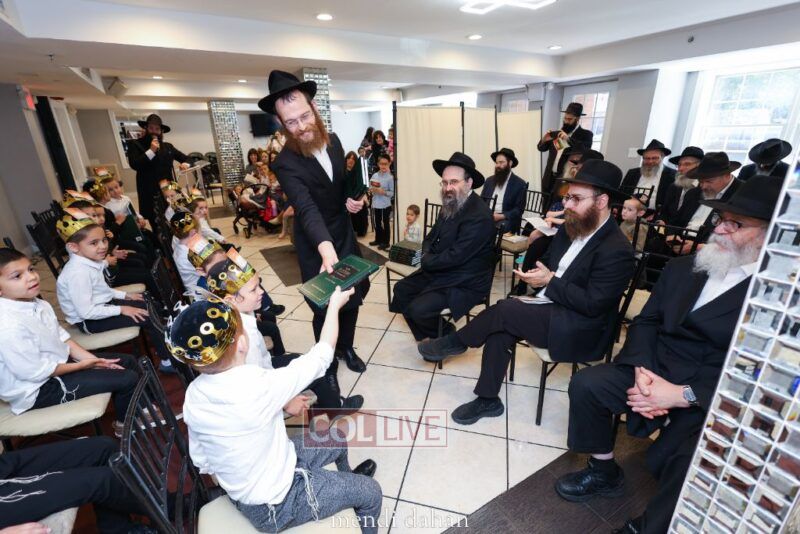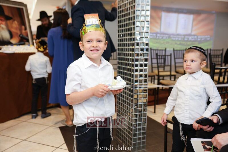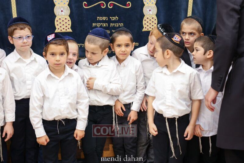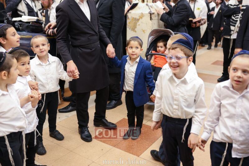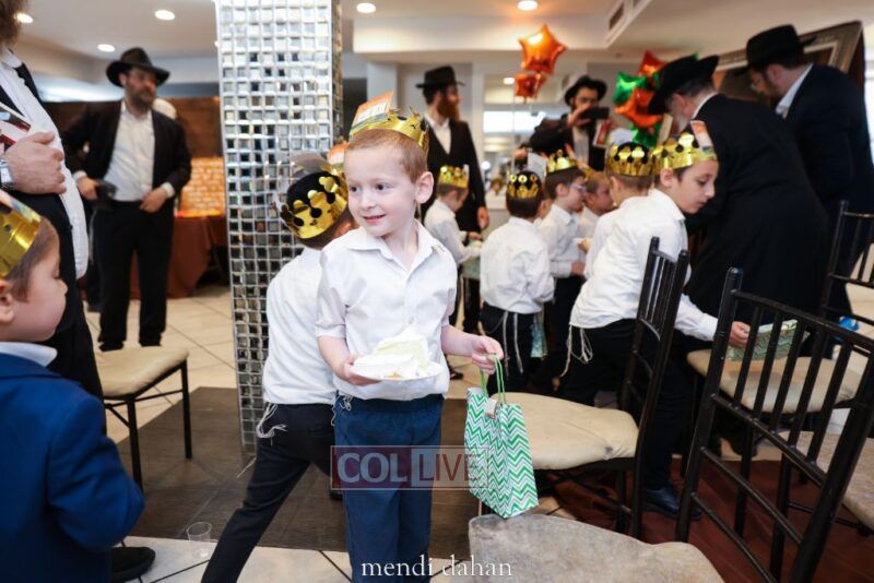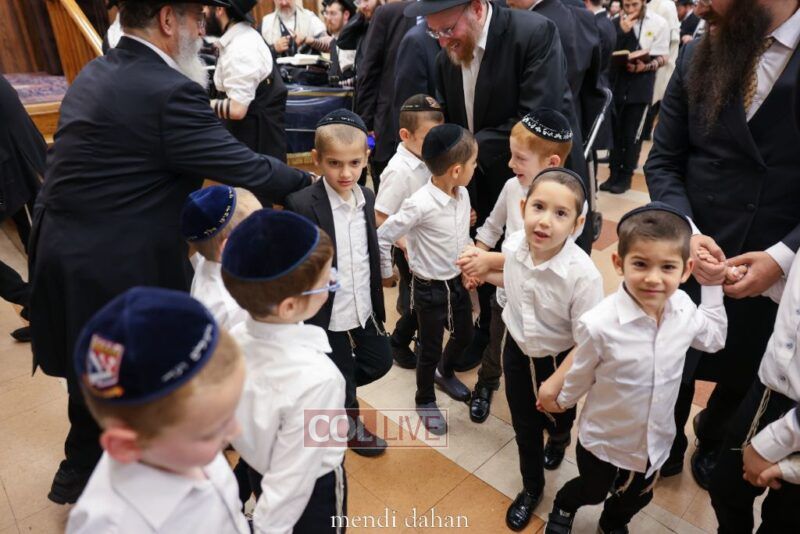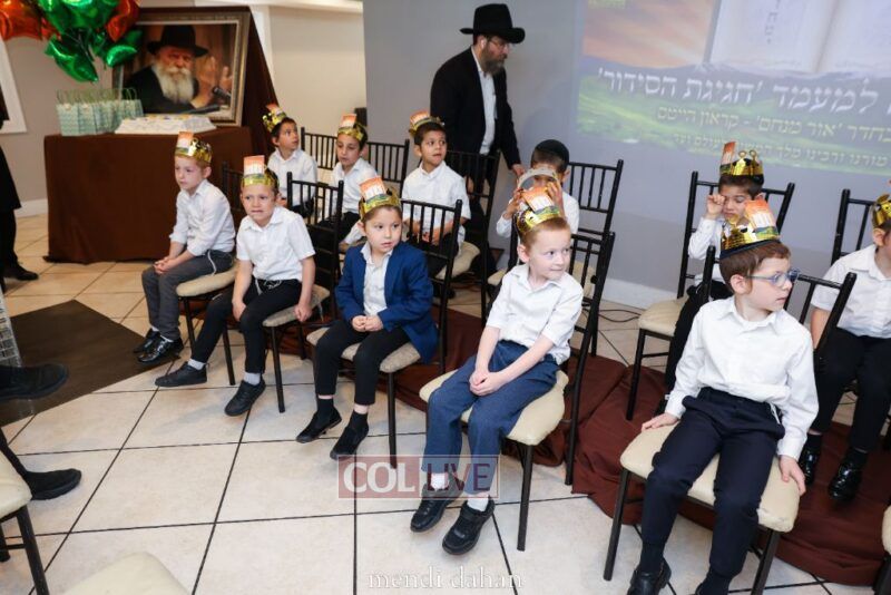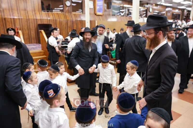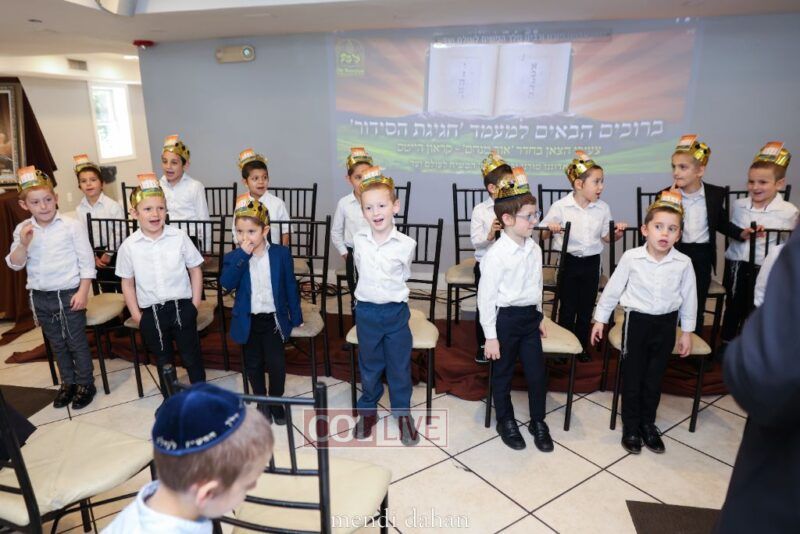 The children then received Birkas Kohanim from the Menahel Hamosdos Rabbi Menachem Mendel Hakohen Hendel, followed by singing and dancing. Each student was presented with their very own Siddur and a special cake from their Melamed.