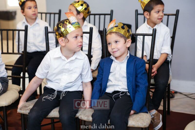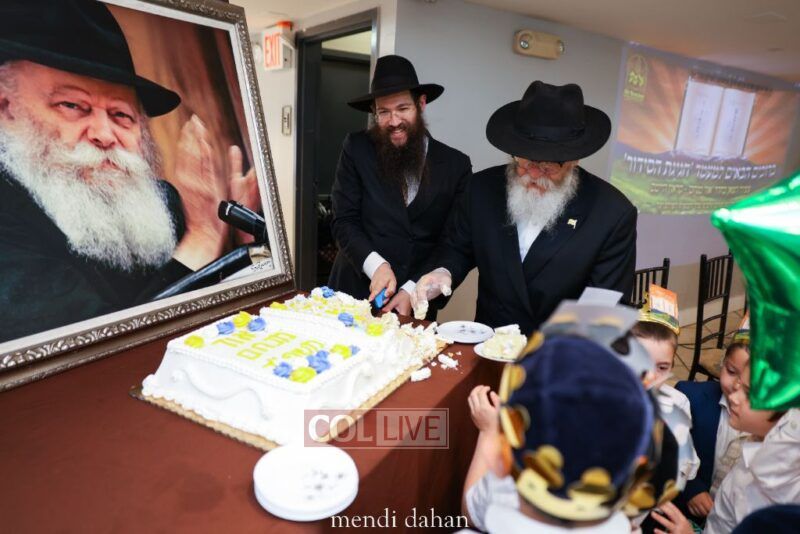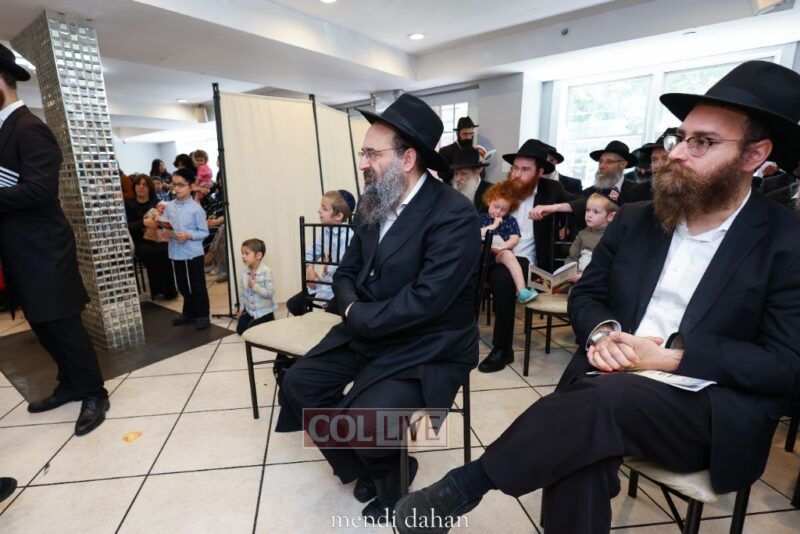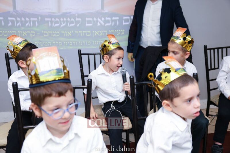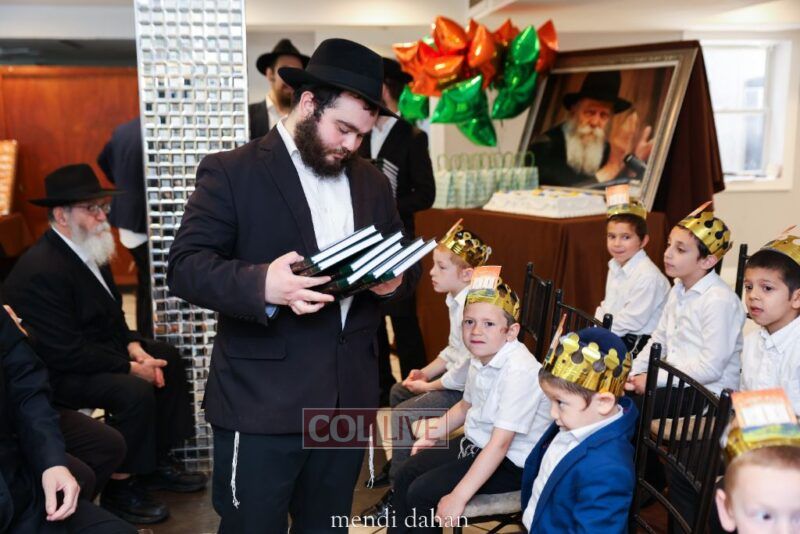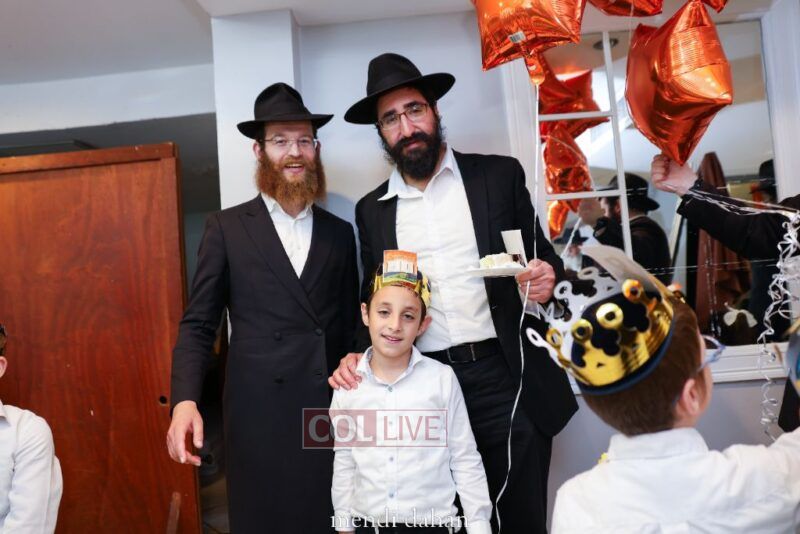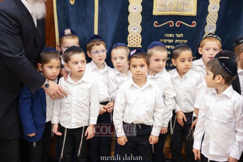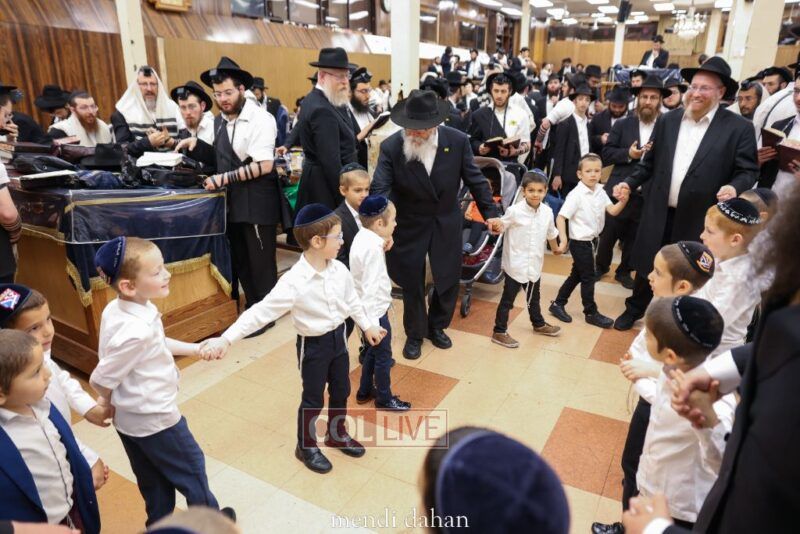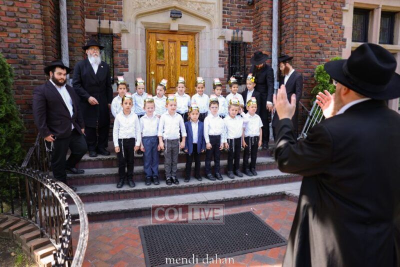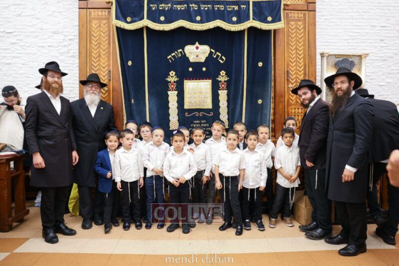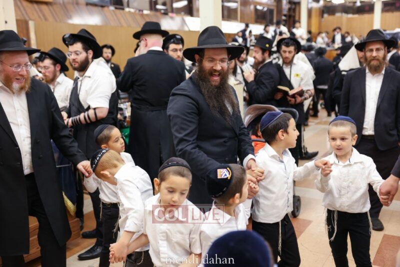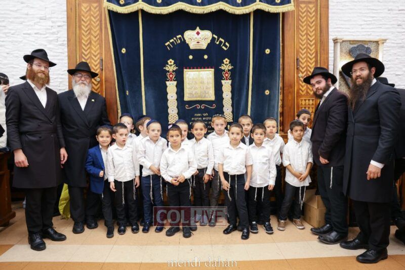 The children then received Birkas Kohanim from the Menahel Hamosdos Rabbi Menachem Mendel Hakohen Hendel, followed by singing and dancing. Each student was presented with their very own Siddur and a special cake from their Melamed.
