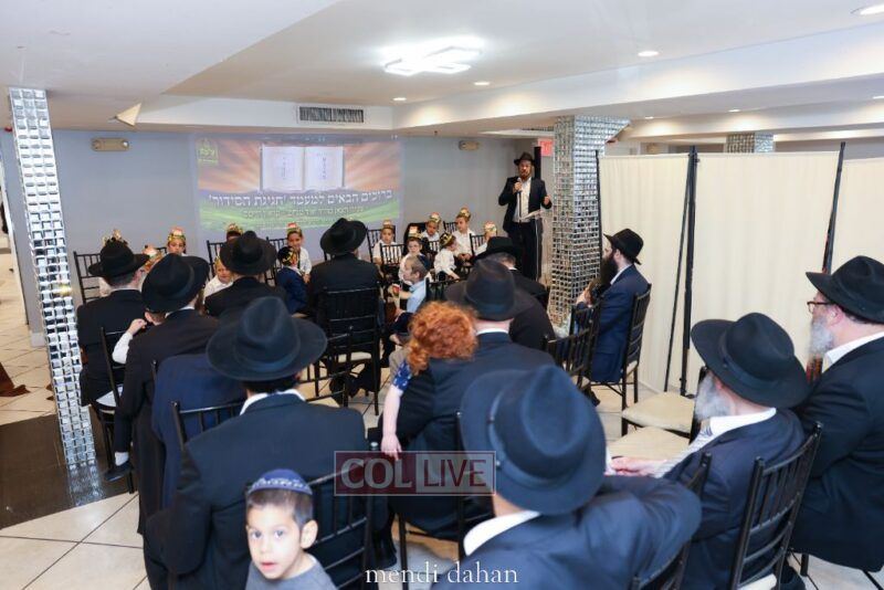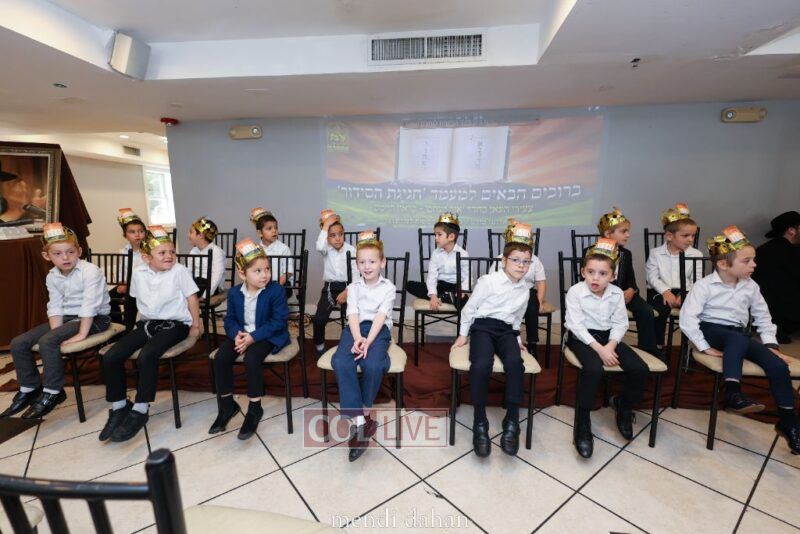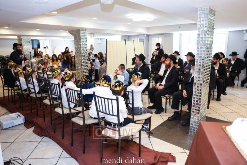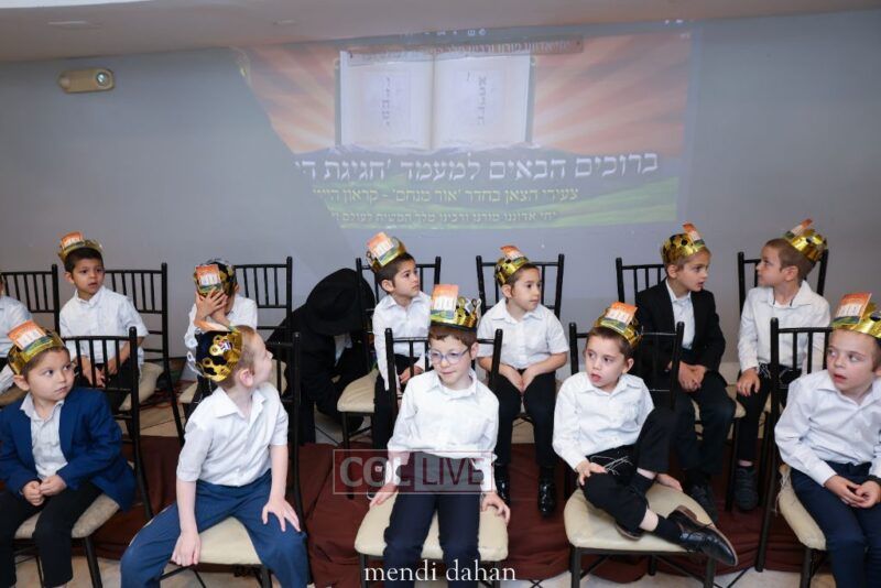 The festivities continued as they proceeded to the Eshel Hall, where the official celebration commenced. The atmosphere was electric with excitement as the chassanim of the Chagigas Siddur, the Pre-1A students, made their grand entrance.