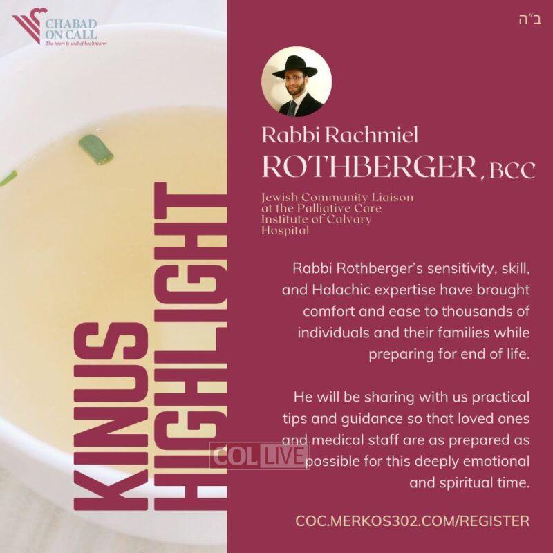 After opening words from Rabbi Mendy Kotlarsky, executive director of Merkos 302, Rabbi Rachmiel Rothberger, BCC, the Jewish Community Liaison at the Palliative Care Institute of Calvary Hospital and a seasoned expert in the sensitivities and halachic nuances of end-of-life care, will share practical tips and guidance relevant to preparing loved ones and medical staff for this deeply emotional and spiritual time.