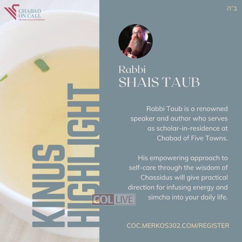 Renowned speaker and author Rabbi Shais Taub will share his approach to self-care rooted in the wisdom of Chassidus. His session will give practical direction for infusing energy and Simcha into your daily life.