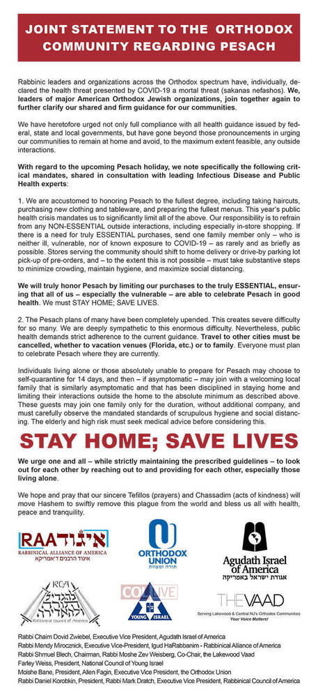 Rabbinic leaders and organizations across the Orthodox spectrum have declared the health threat presented by COVID-19 a mortal threat (sakanas nefashos) and have released a statement urging all communities to stay home this Pesach.