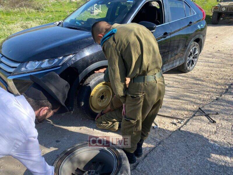 I called my friend Matan, who I had been in touch with about reading the Megillah on base, and lo and behold they had two soldiers who knew how to change a tire. Around 25 minutes later the two soldiers pulled up, who were more than happy to help us out.