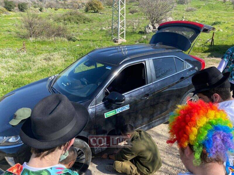 During the 45 minute saga of changing the tire, the Bochurim couldn’t have had a more positive spirit. They stopped every car that drove down the road offering them to put on Tefillin, giving out Mishloach Manos and just adding a little Purim joy to the driver’s day.