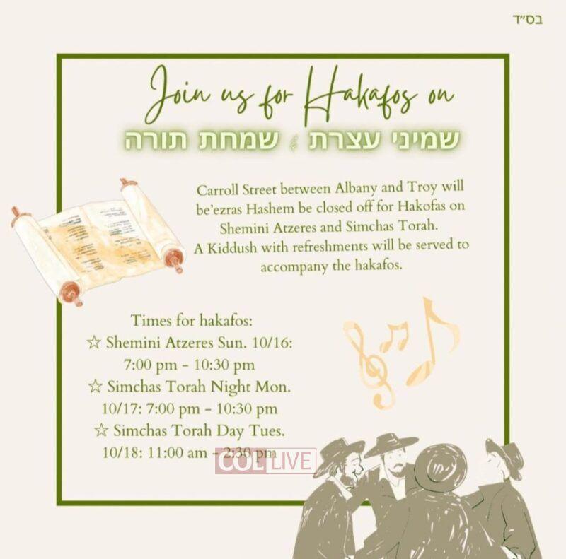 Carroll Street between Albany and Troy Avenues will be closed off for Hakafos for Shmini Atzeres and Simchas Torah.