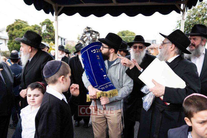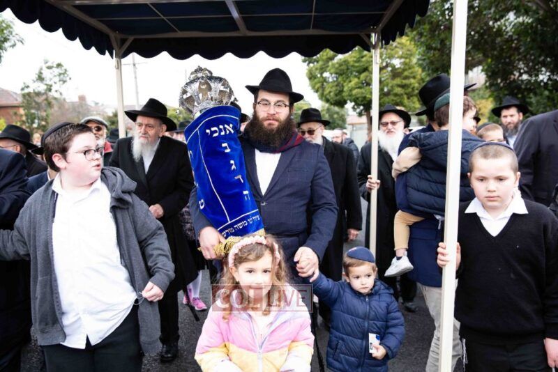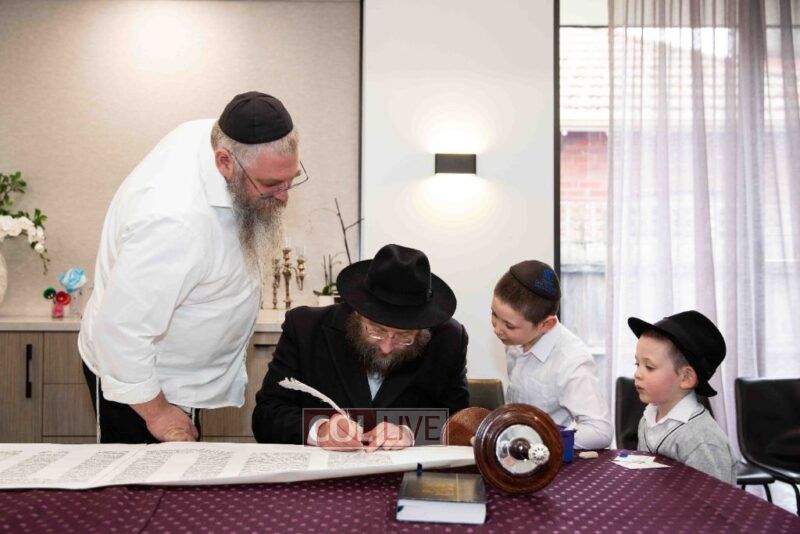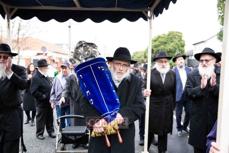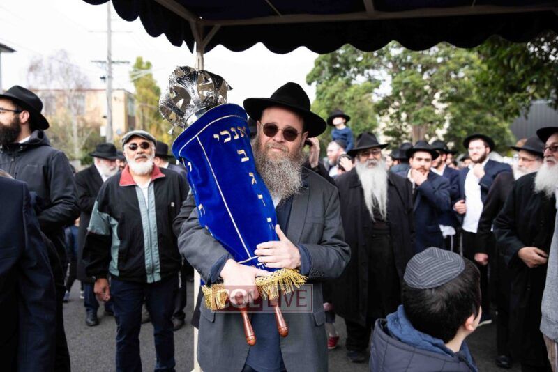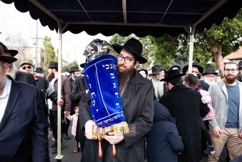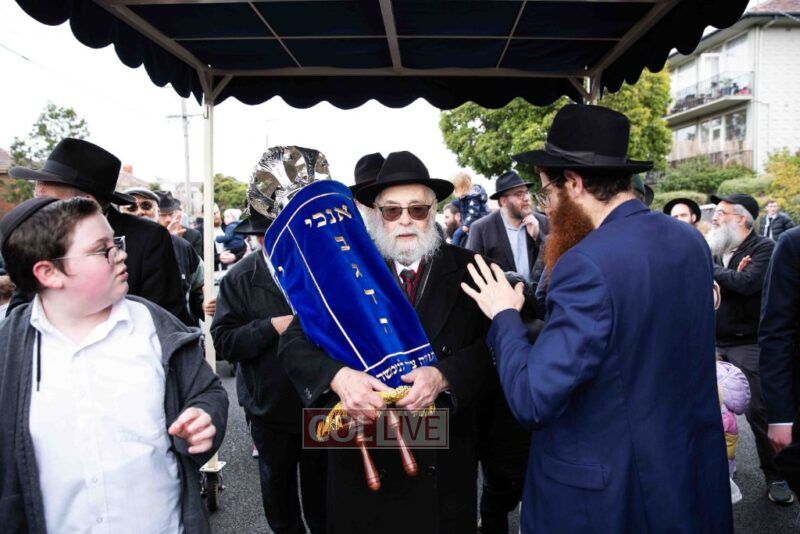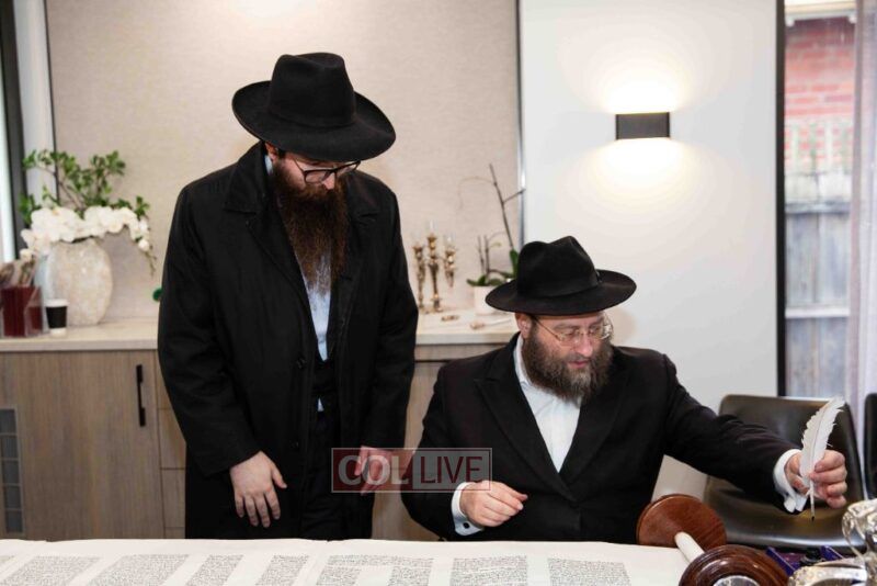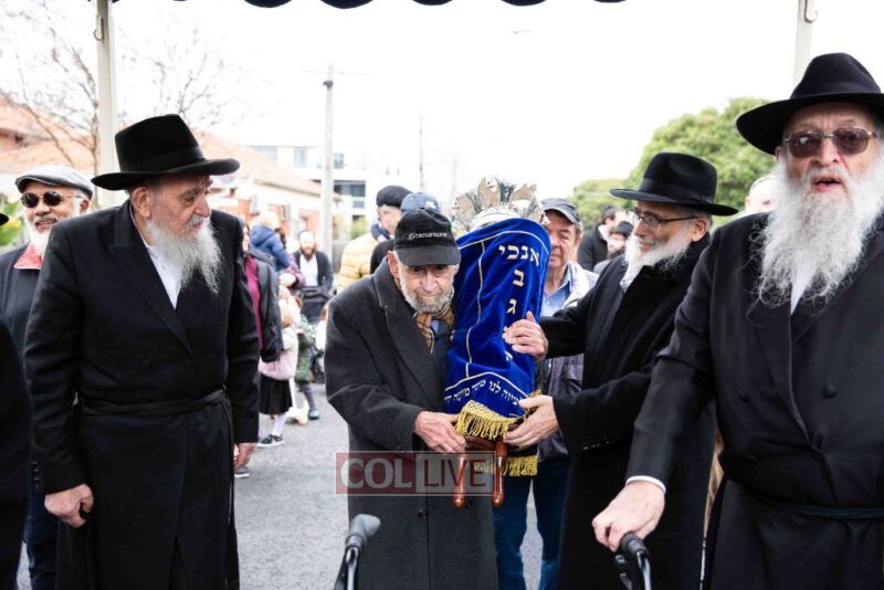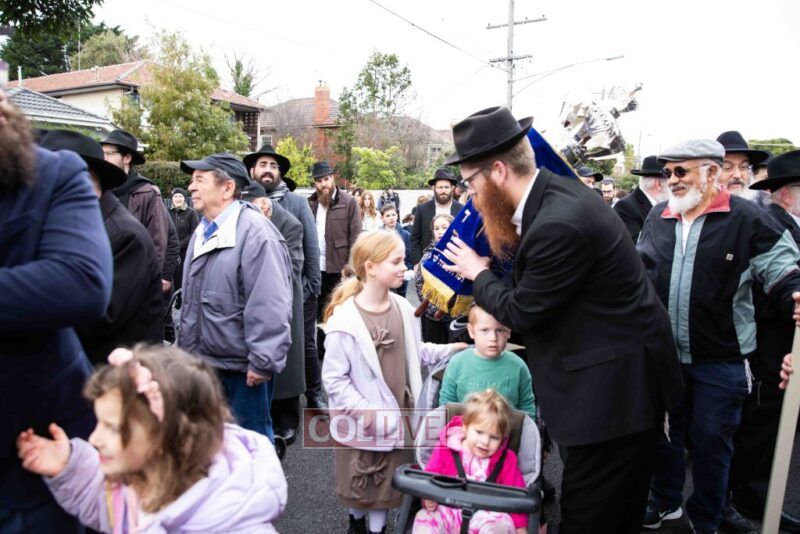 The completion of the Sefer Torah took place at the home of Rabbi and Mrs Ari Schachter, where Rabbis Zalman and Avrohom Perlow wrote the last letters as family members looked on. This was followed by the traditional street procession to the Rabbinical College in Alexandra Street, East St Kilda where the Hachnosas Sefer Torah ceremony took place.