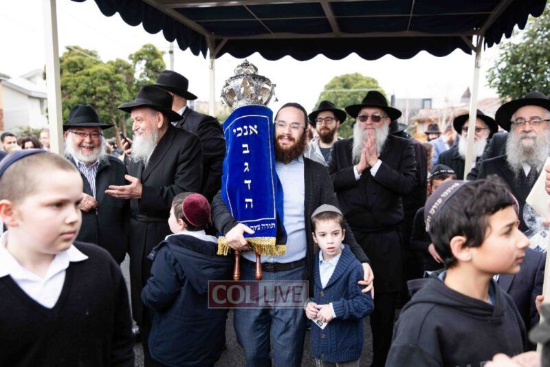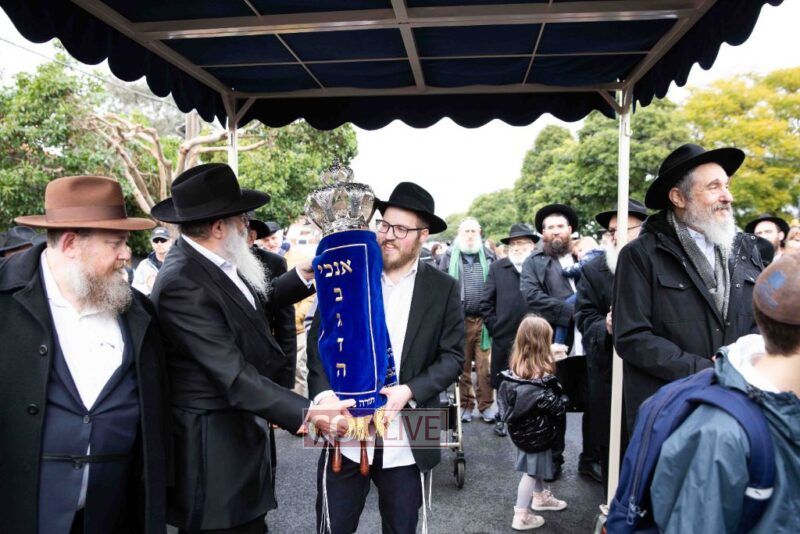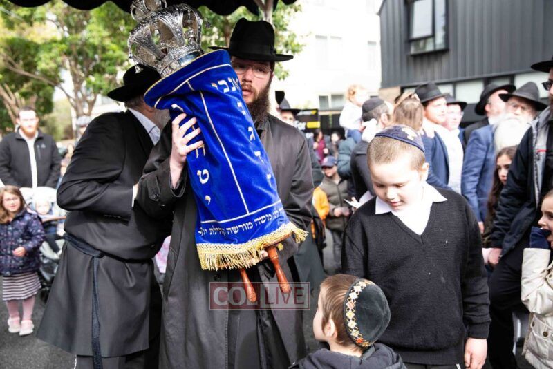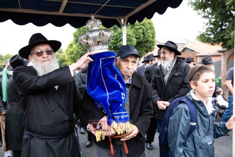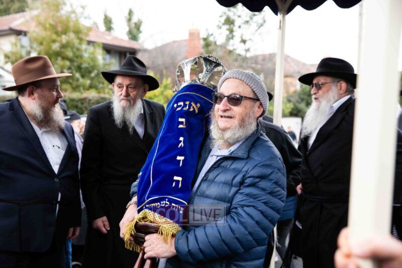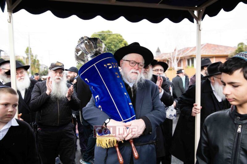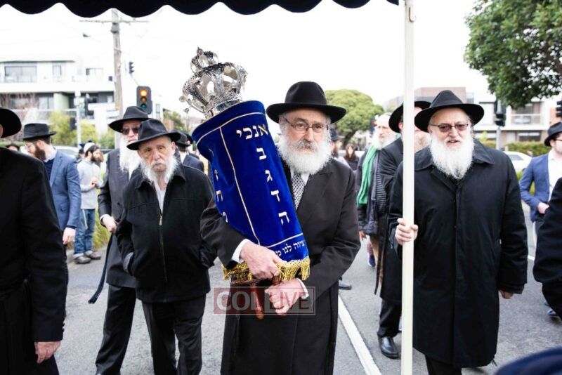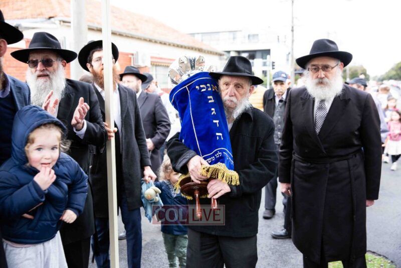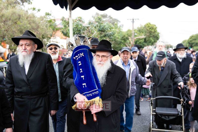 The completion of the Sefer Torah took place at the home of Rabbi and Mrs Ari Schachter, where Rabbis Zalman and Avrohom Perlow wrote the last letters as family members looked on. This was followed by the traditional street procession to the Rabbinical College in Alexandra Street, East St Kilda where the Hachnosas Sefer Torah ceremony took place.