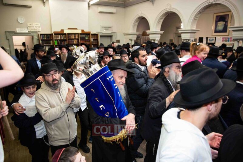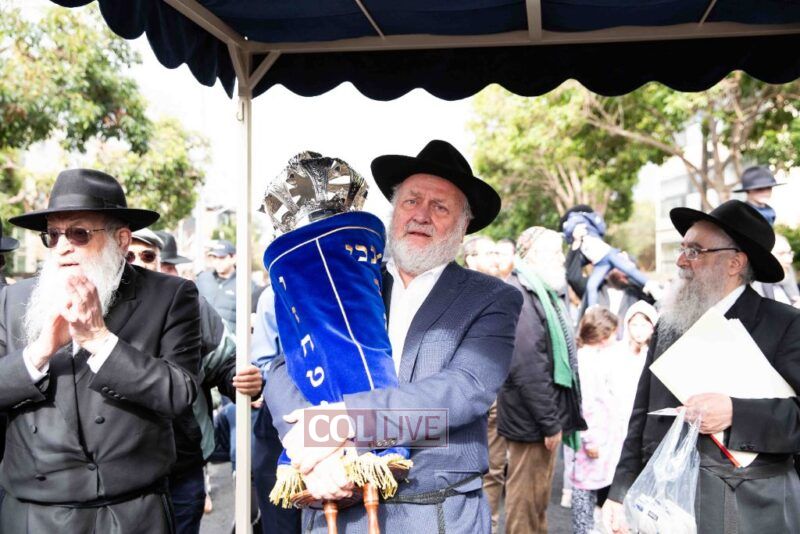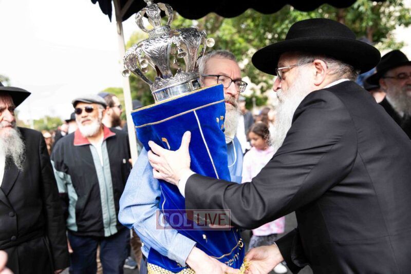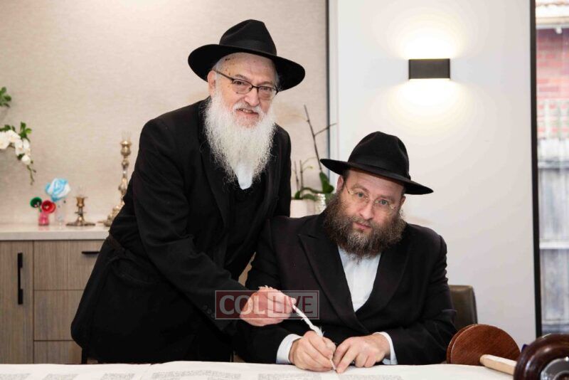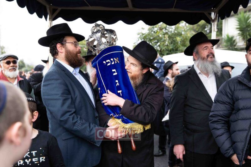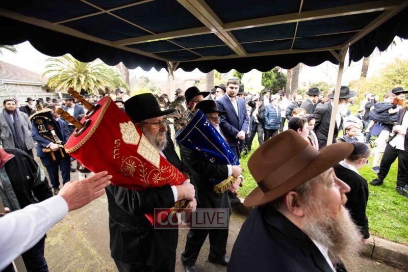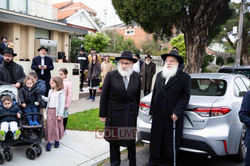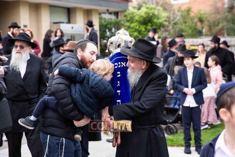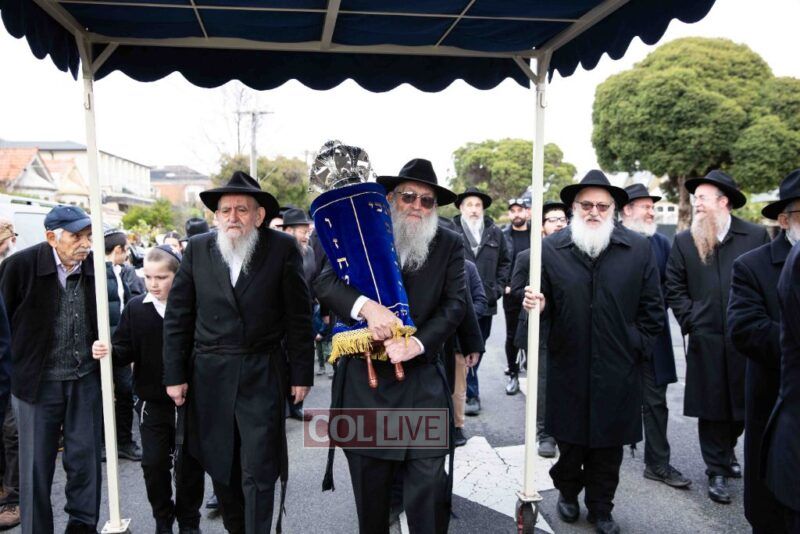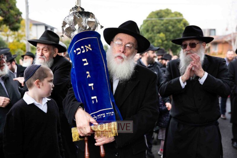 The completion of the Sefer Torah took place at the home of Rabbi and Mrs Ari Schachter, where Rabbis Zalman and Avrohom Perlow wrote the last letters as family members looked on. This was followed by the traditional street procession to the Rabbinical College in Alexandra Street, East St Kilda where the Hachnosas Sefer Torah ceremony took place.