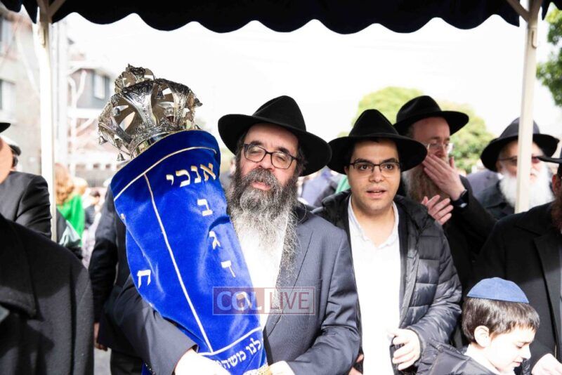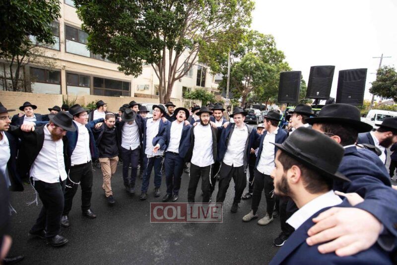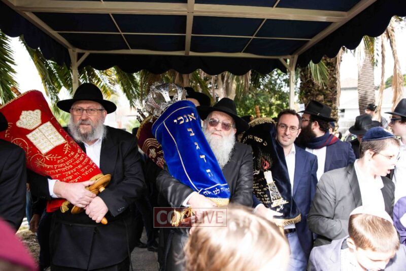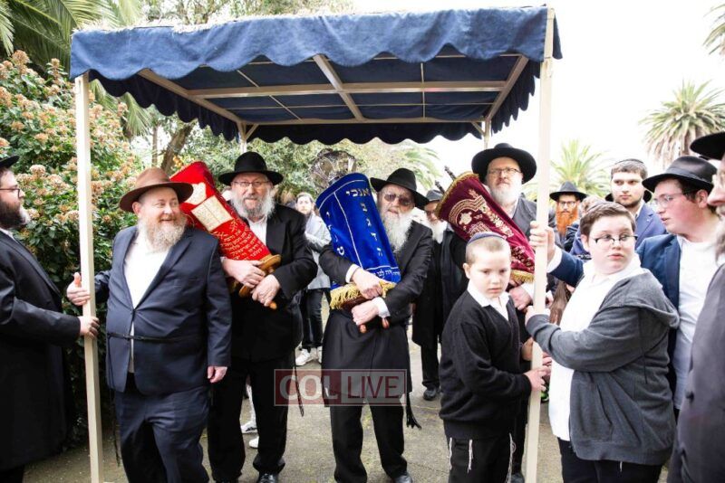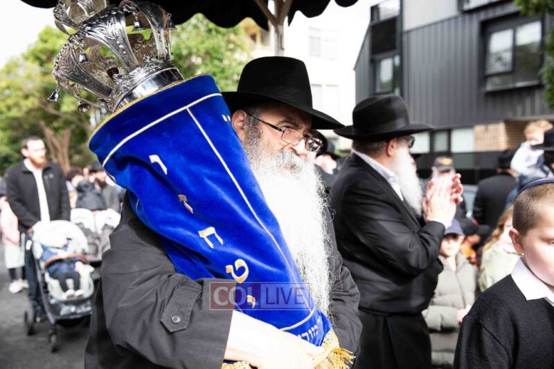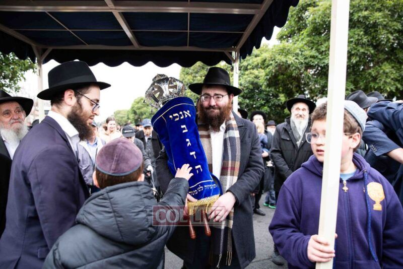 The weather held out to provide a beautiful atmosphere for the celebrations to be held. Men, women and children paraded along Alexandra Street to the accompaniment of chassidic music provided by Yumi Rosenbaum. Special cards with pieces of the mantel cloth were distributed to children in the crowd.